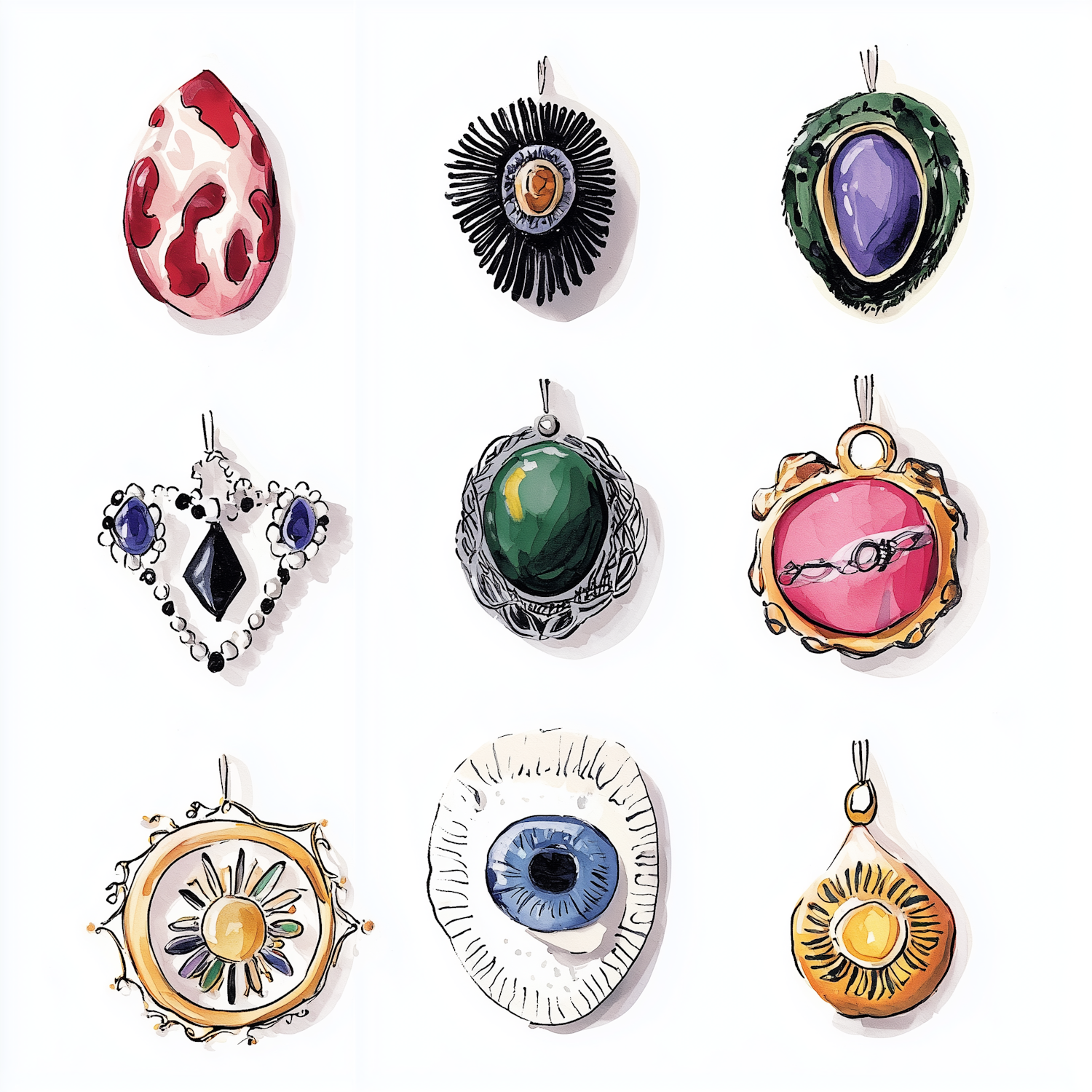 Nine unique pendants with intricate designs, featuring gemstones, sun motifs, and artistic details, arranged in a 3x3 grid.