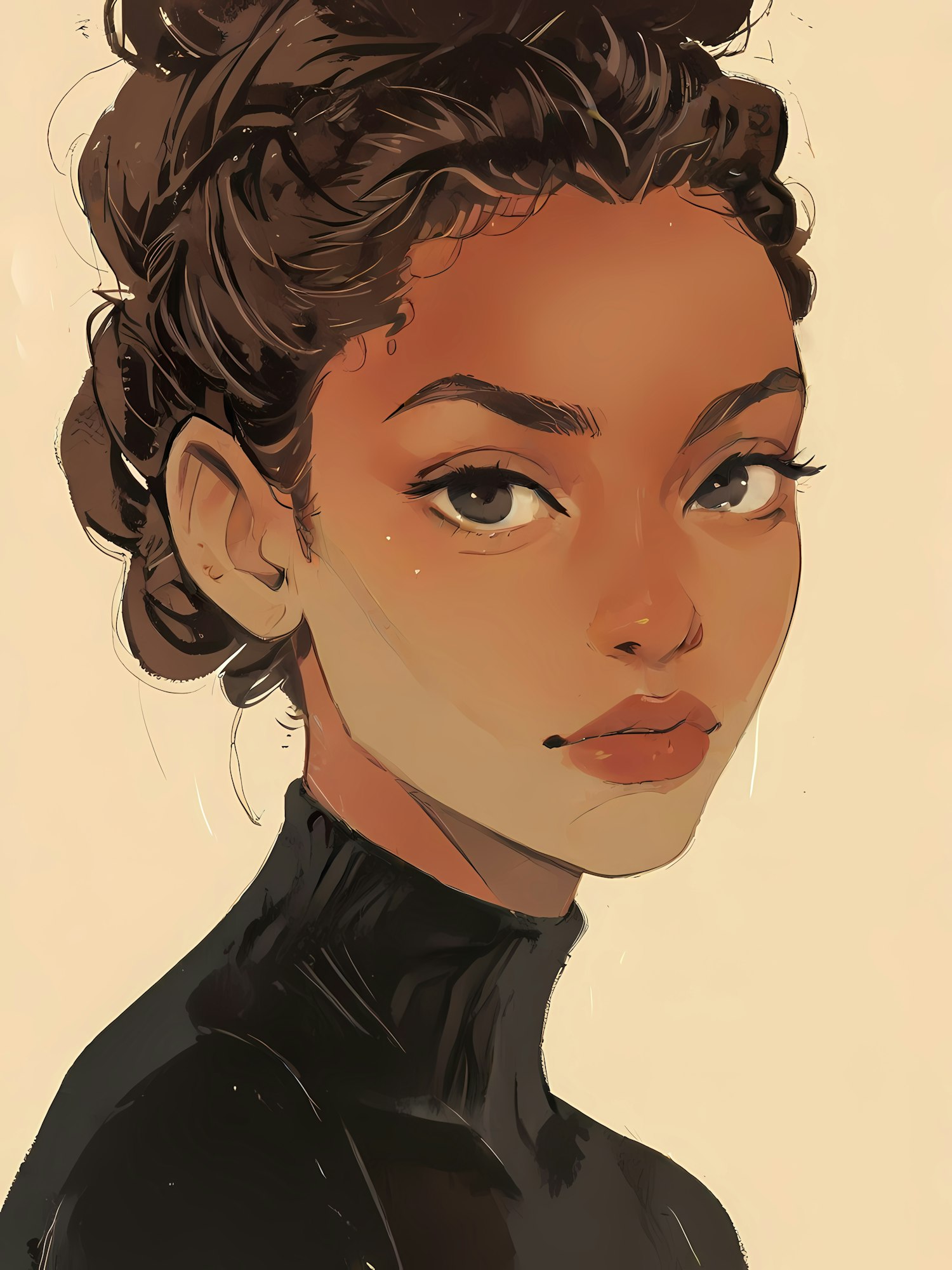 Artistic illustration of a woman with curly hair styled up, wearing a black outfit against a neutral background, exuding elegance.