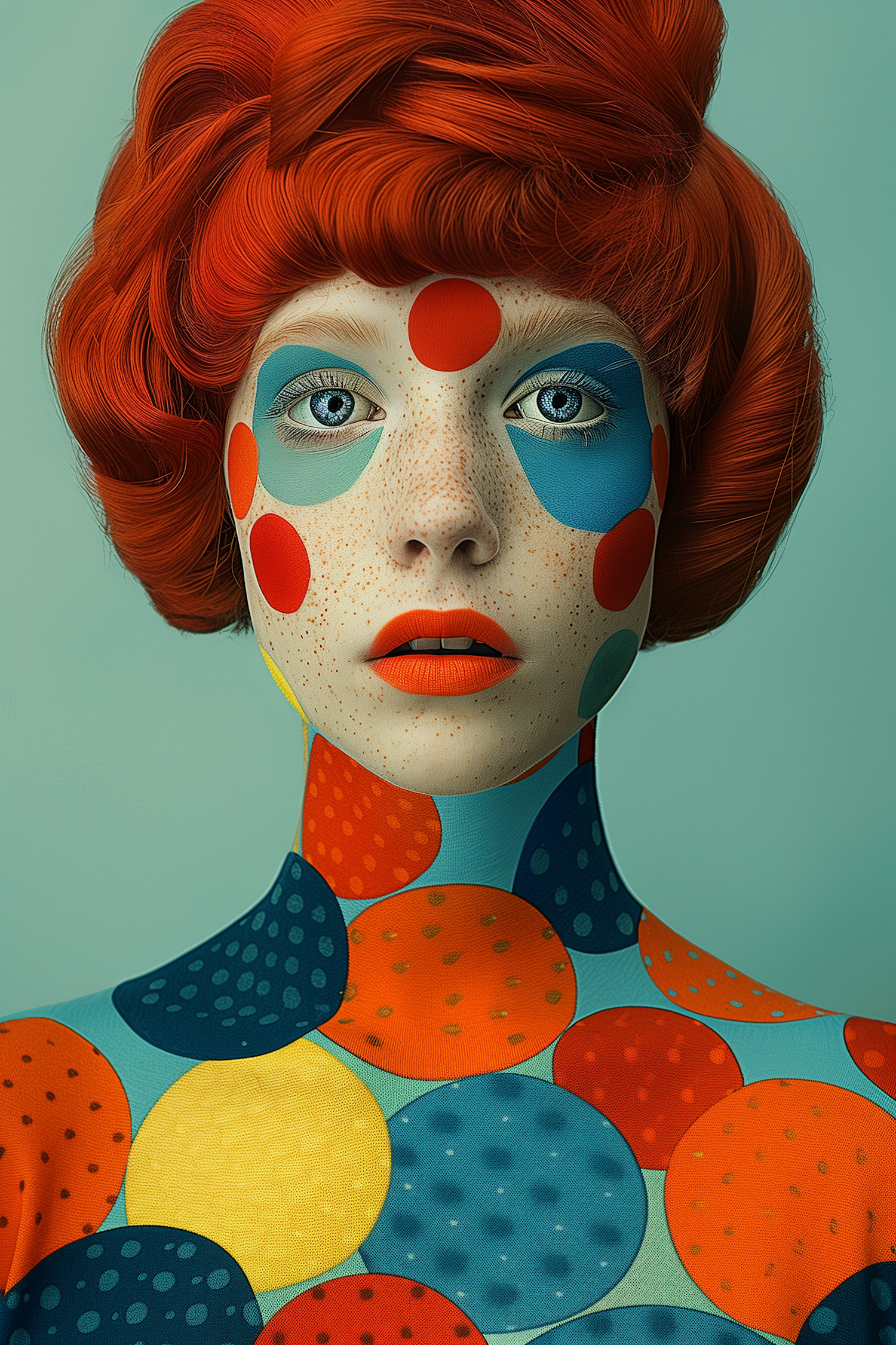 Vibrant portrait with red hair, blue eyes, and colorful polka dot makeup. Bold artistic expression with a teal background.