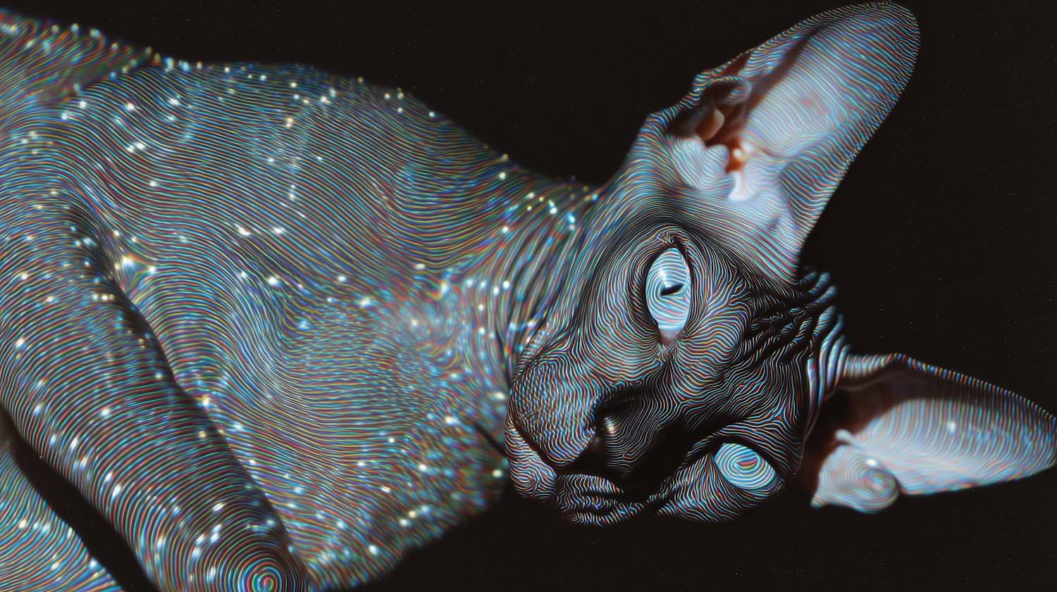 Abstract, multicolored image of a sphynx cat with intricate patterns on a dark background, merging surreal artistry and feline form.