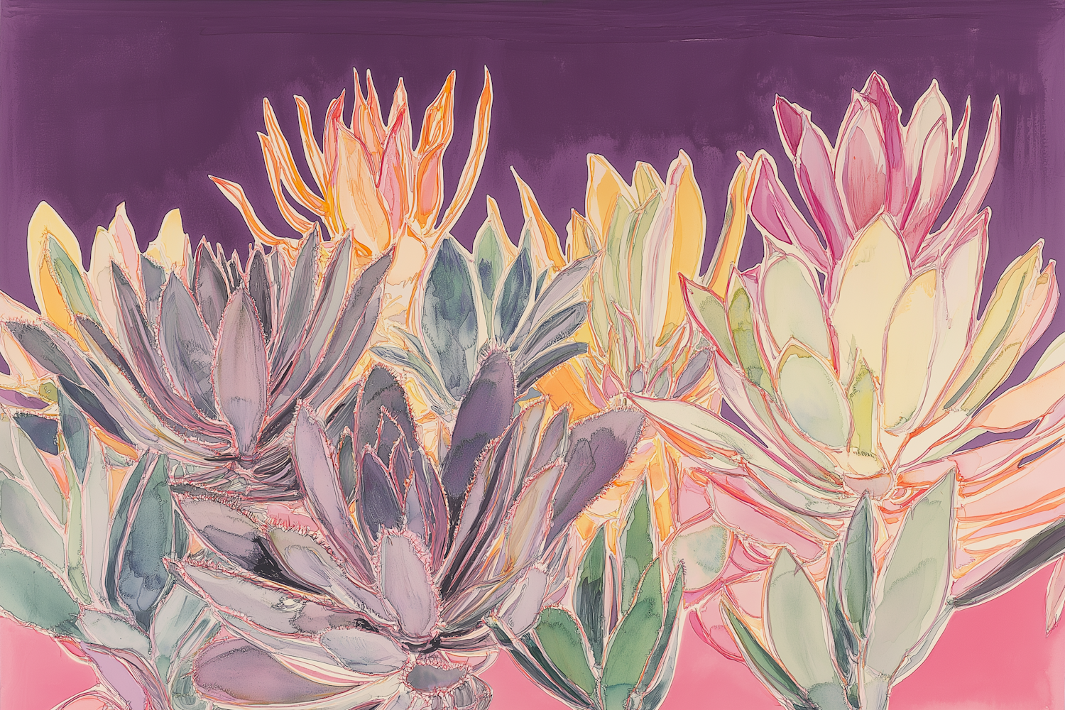 Colorful illustration of succulents with vibrant purples, pinks, and greens against a deep purple background.