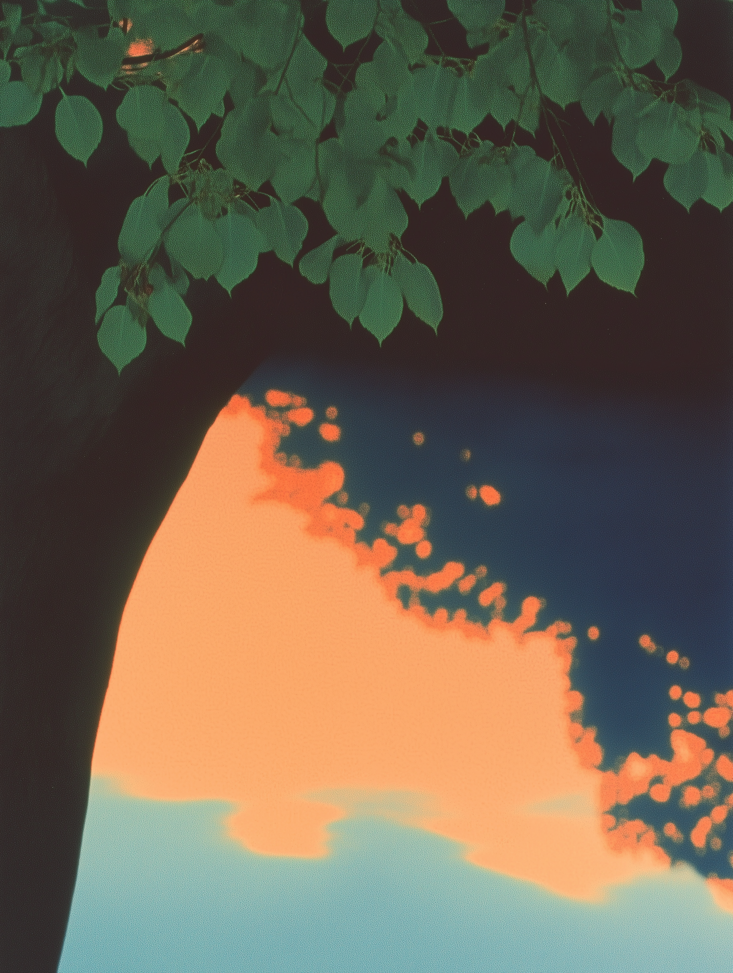 Lush green leaves hang from a tree against a dreamy orange and blue gradient background, evoking a tranquil sunset vibe.