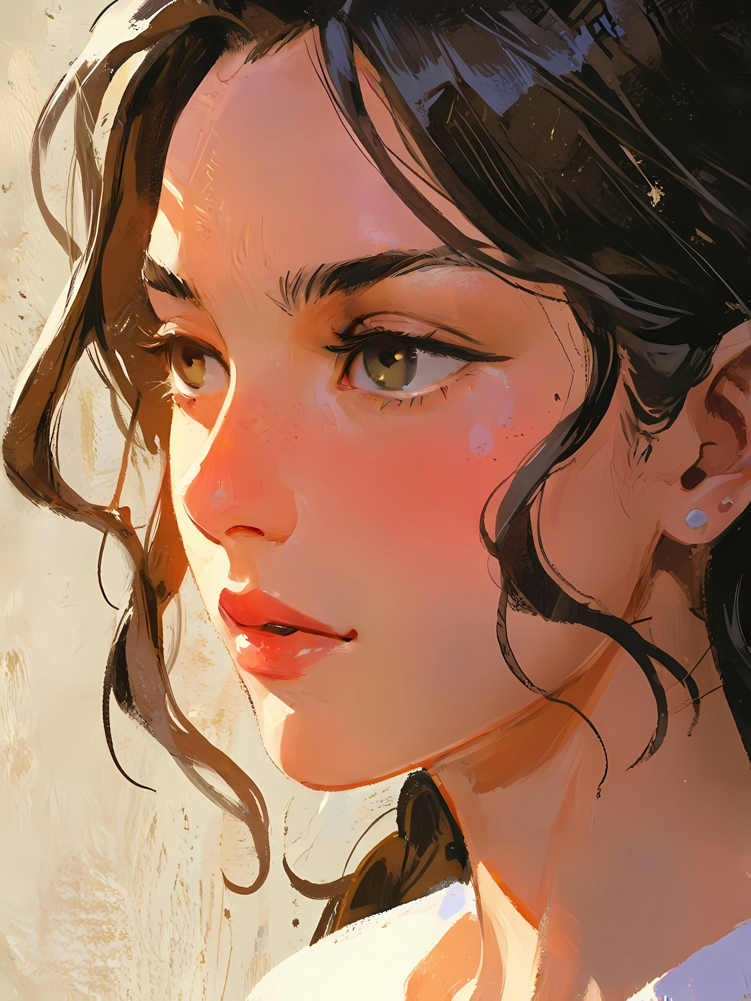 Digital painting of a woman with soft features, expressive eyes, wavy hair, and warm tones, radiating artistry and tranquility.