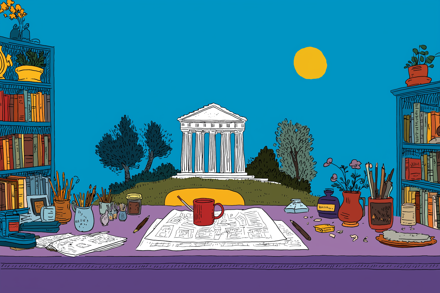 A vibrant illustration of an artist's desk with tools, bookshelves, and a scenic view of a classical temple under a sunny sky.