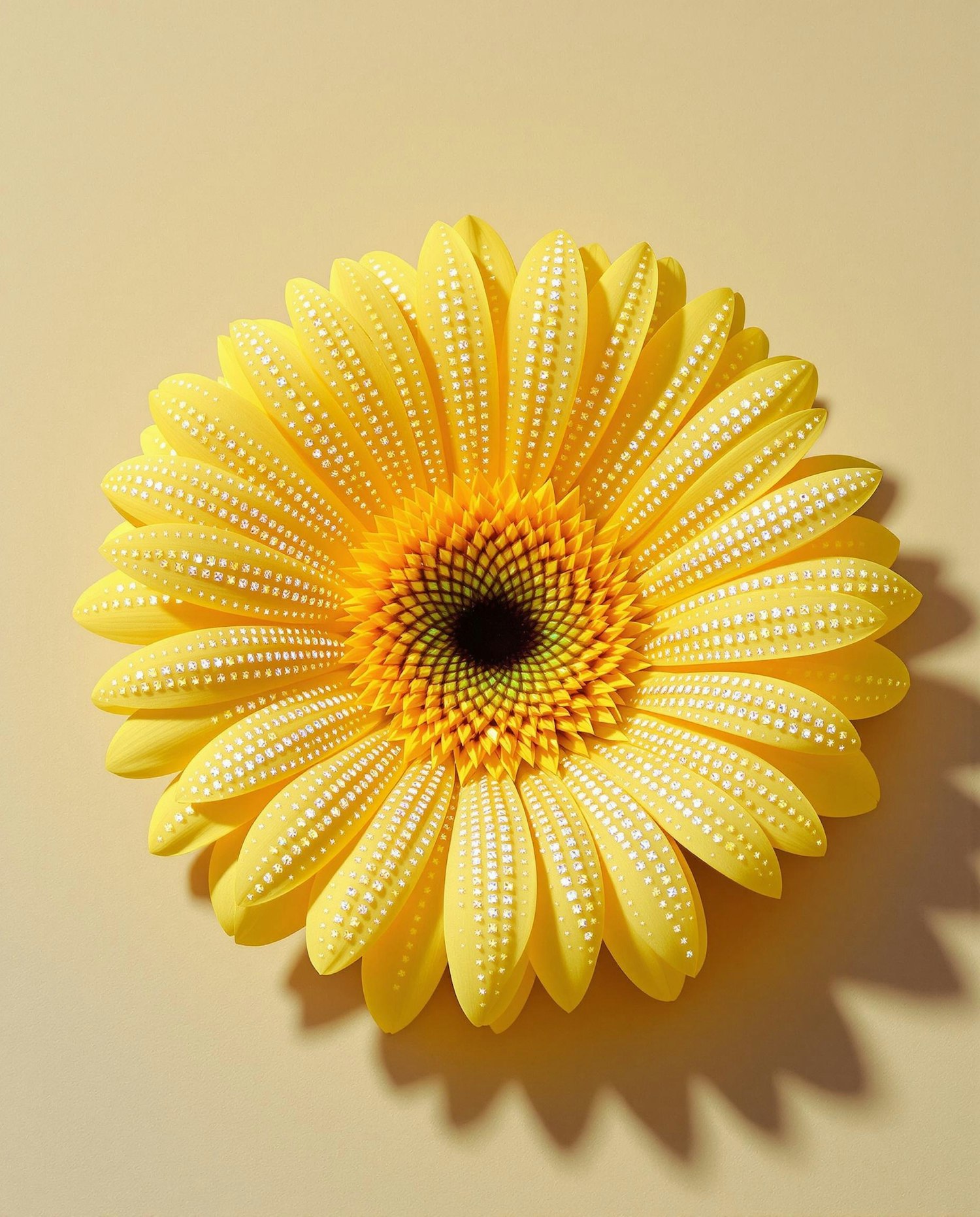 A stunning yellow flower with intricate white dot patterns on its petals, set against a soft beige background. Perfect for artistic inspiration.