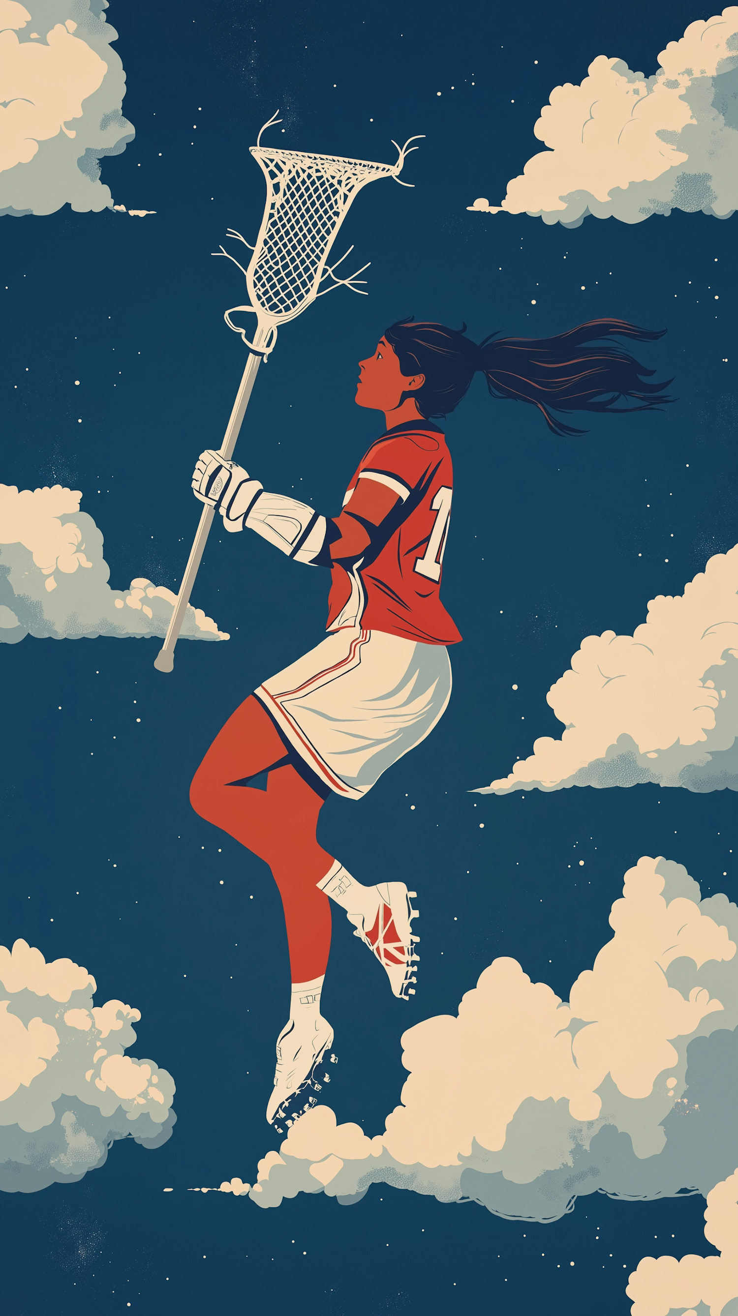 Illustration of a female lacrosse player flying through a starry sky with clouds, wearing a red jersey and holding a lacrosse stick.