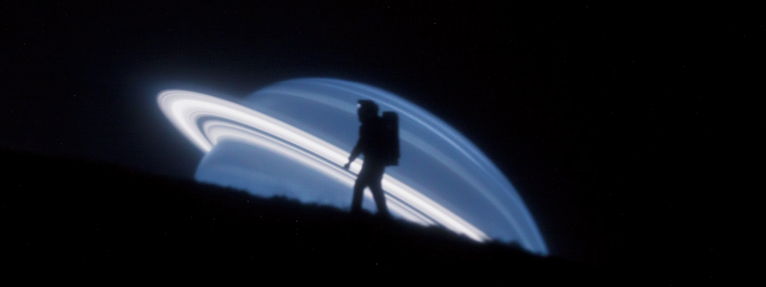 A silhouette of an astronaut stands before glowing planetary rings, creating a surreal and captivating space exploration scene.