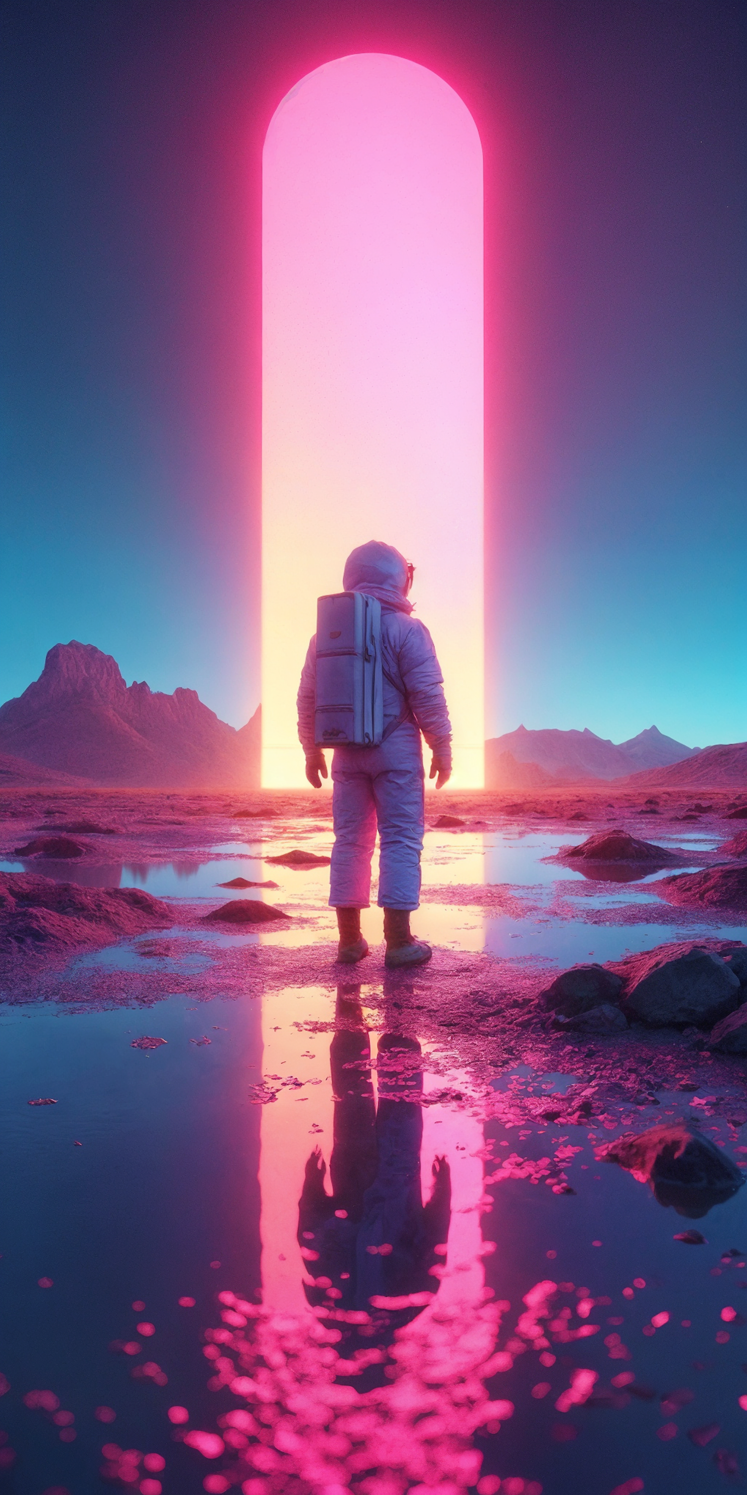A lone astronaut stands before a glowing pink portal on an alien landscape, with reflective water and distant mountains under a surreal sky.