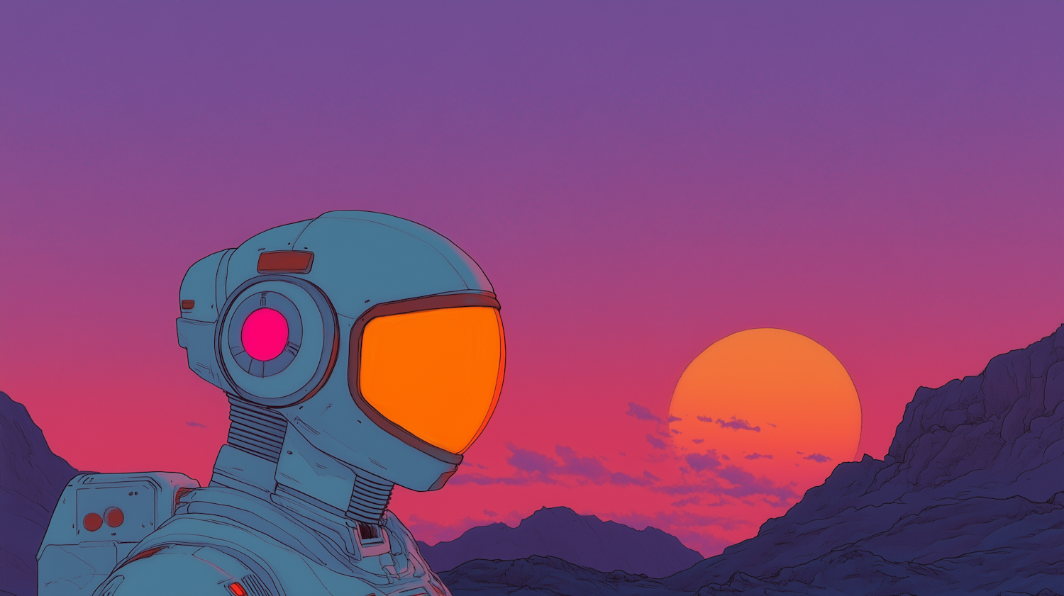 Futuristic astronaut with orange visor against a vibrant sunset, featuring a purple-pink sky and rugged mountain silhouettes.