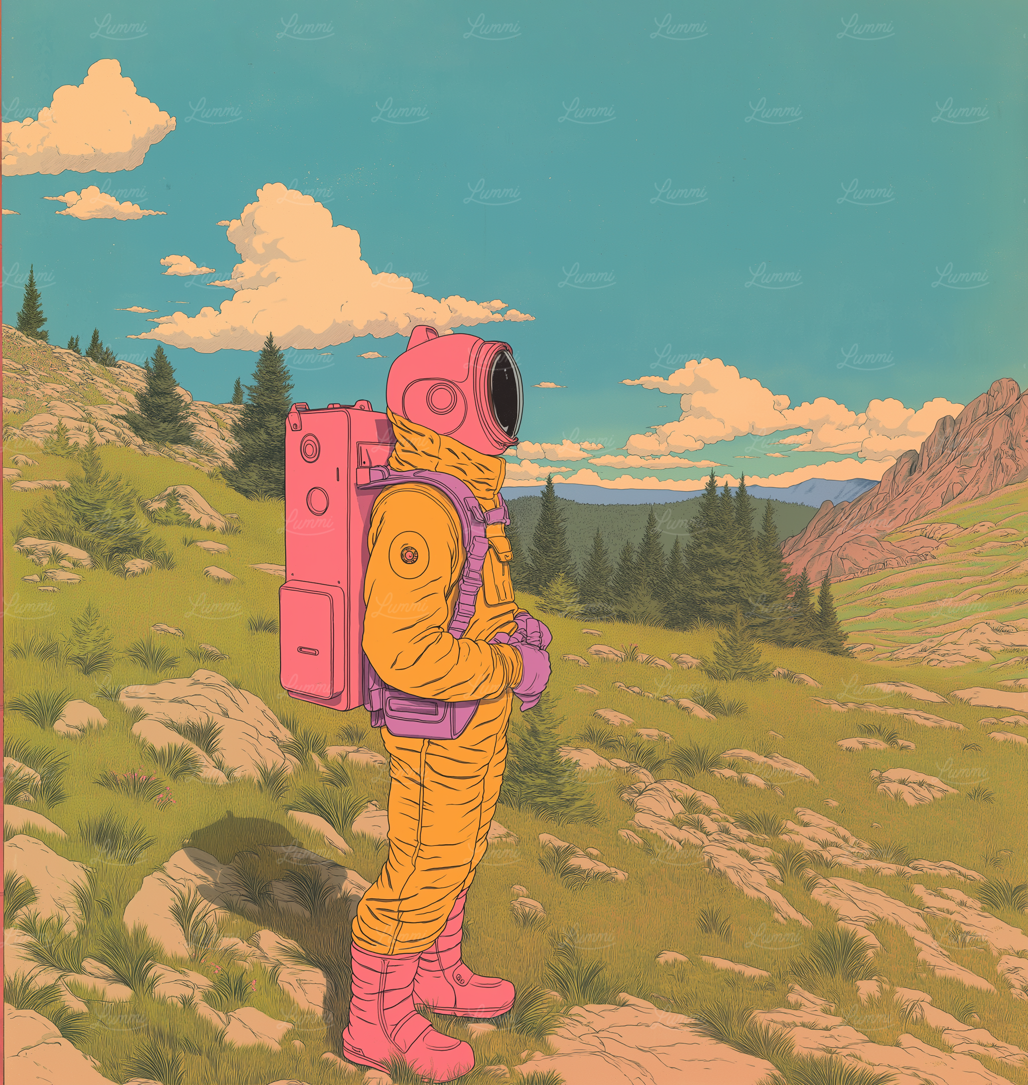 A colorful illustration of an astronaut in a vibrant landscape, blending space exploration with nature's beauty.