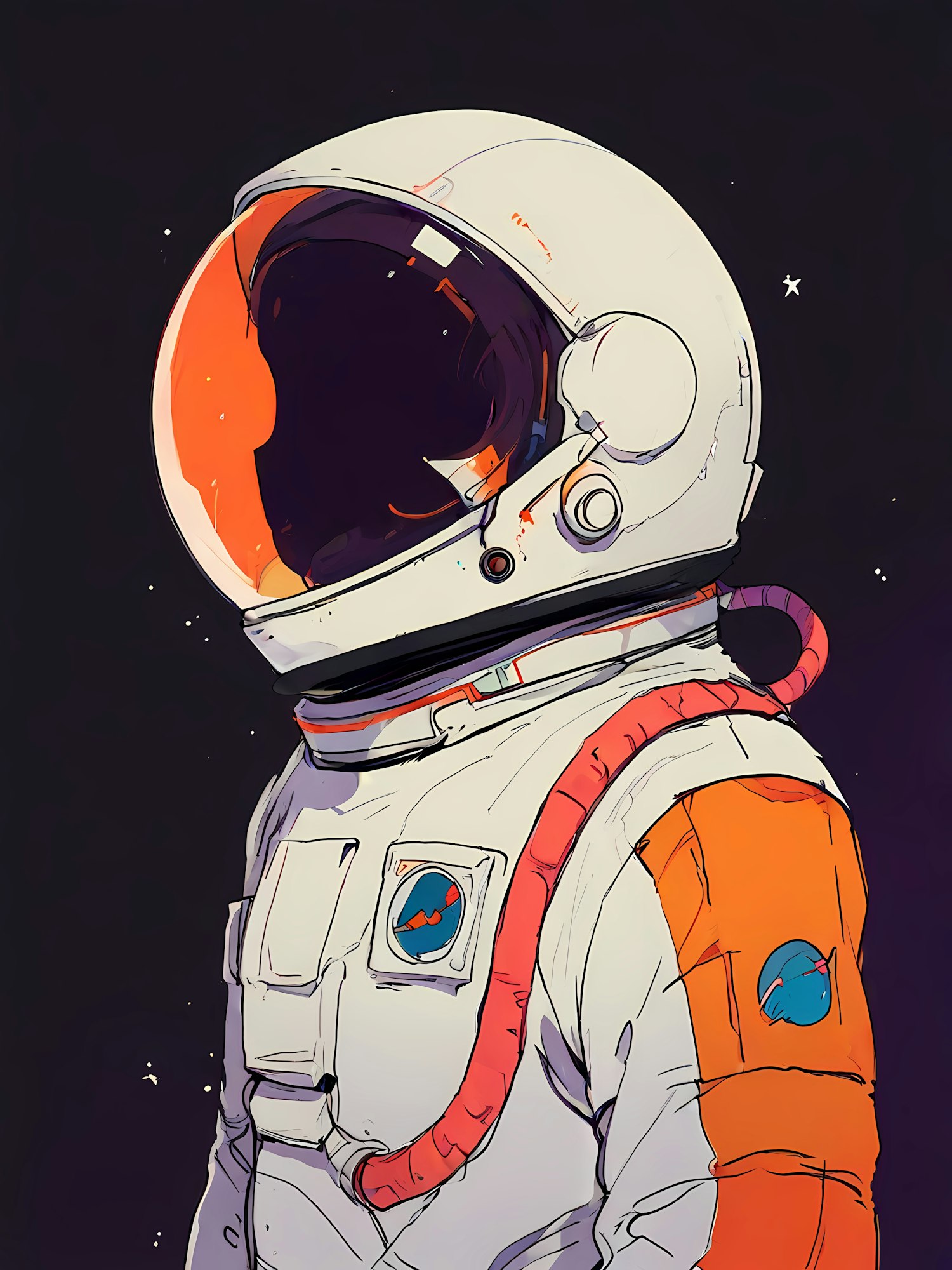 Illustration of an astronaut in a white and orange space suit with a reflective helmet, set against a starry black background.