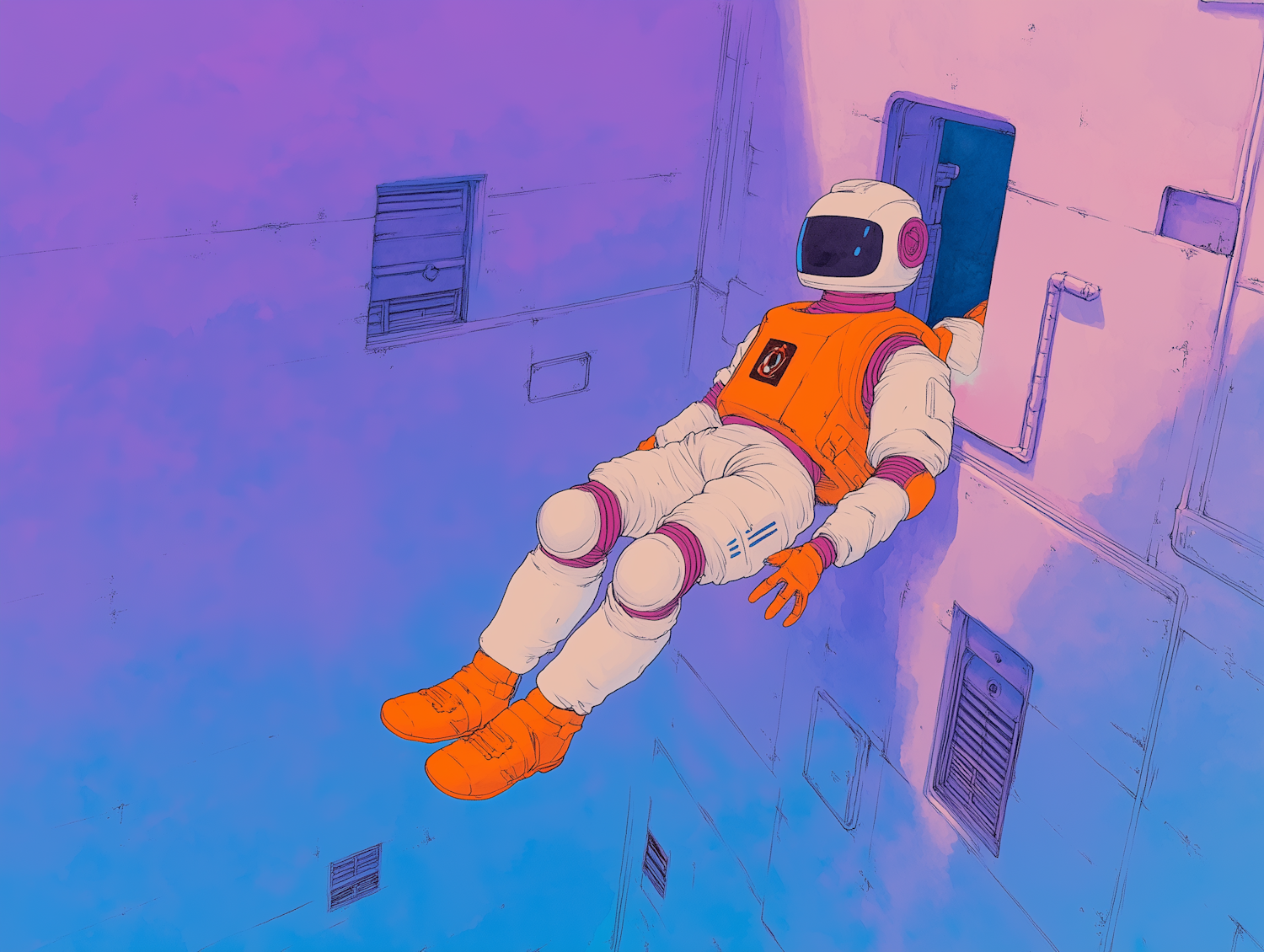 A lone astronaut in a white and orange suit floats in a surreal purple and pink environment, emerging from a hatch.