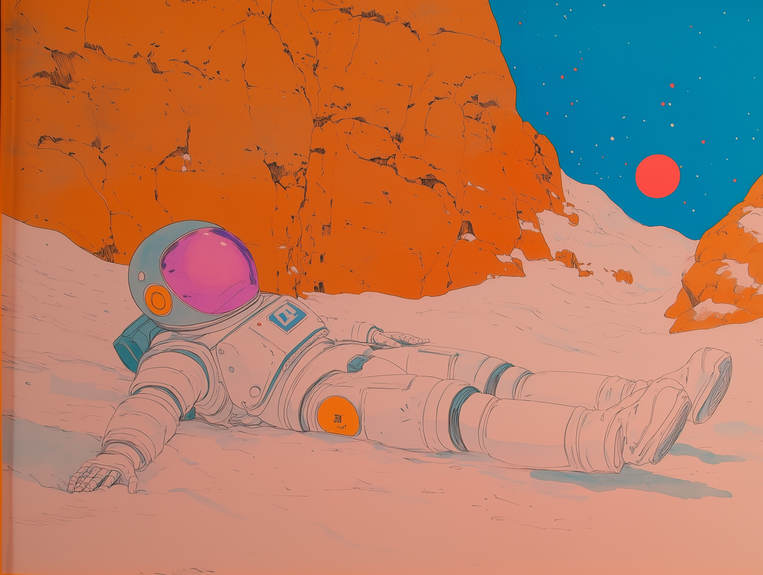 Astronaut in a white suit with purple visor lies on a rocky landscape under a starry sky with a red sun, surrounded by orange cliffs.