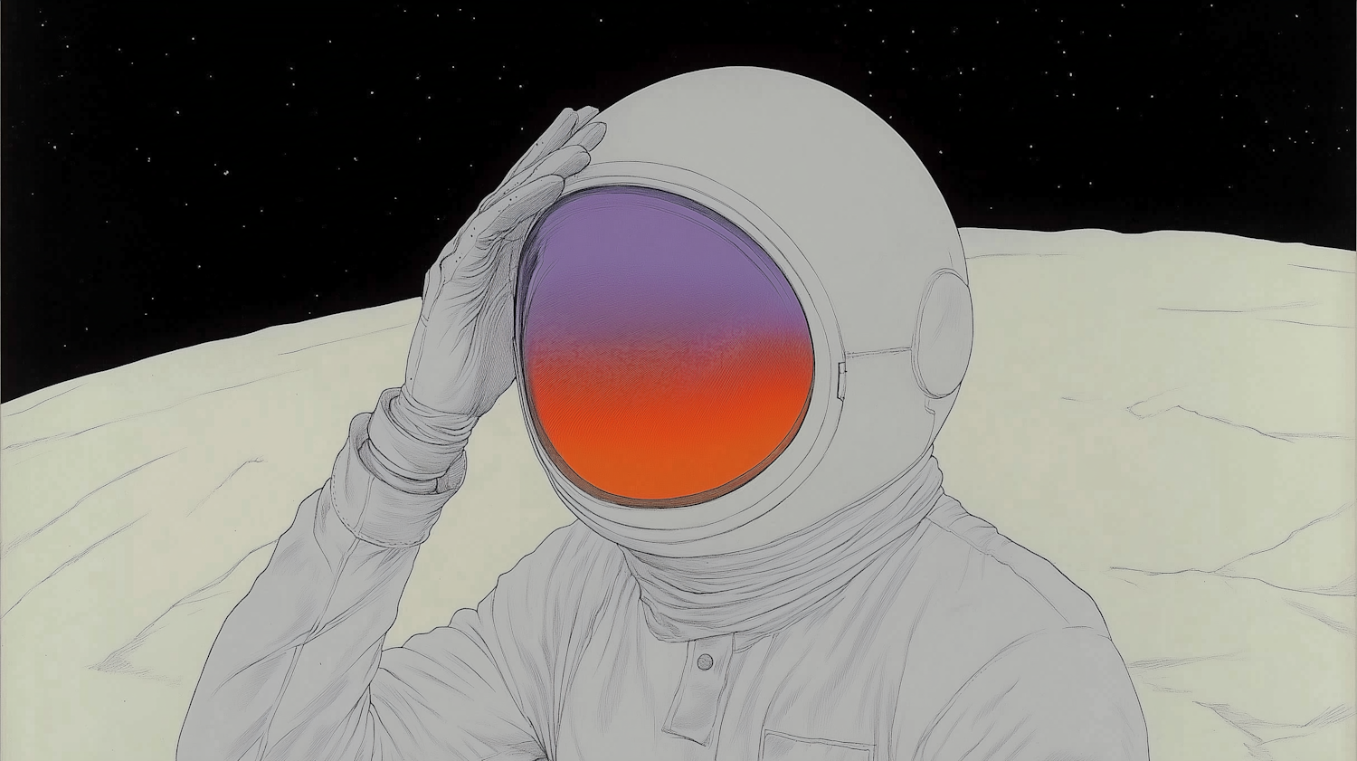 Surreal astronaut illustration with a sunset gradient visor, standing on a lunar surface under a starry sky. Minimalist and striking.