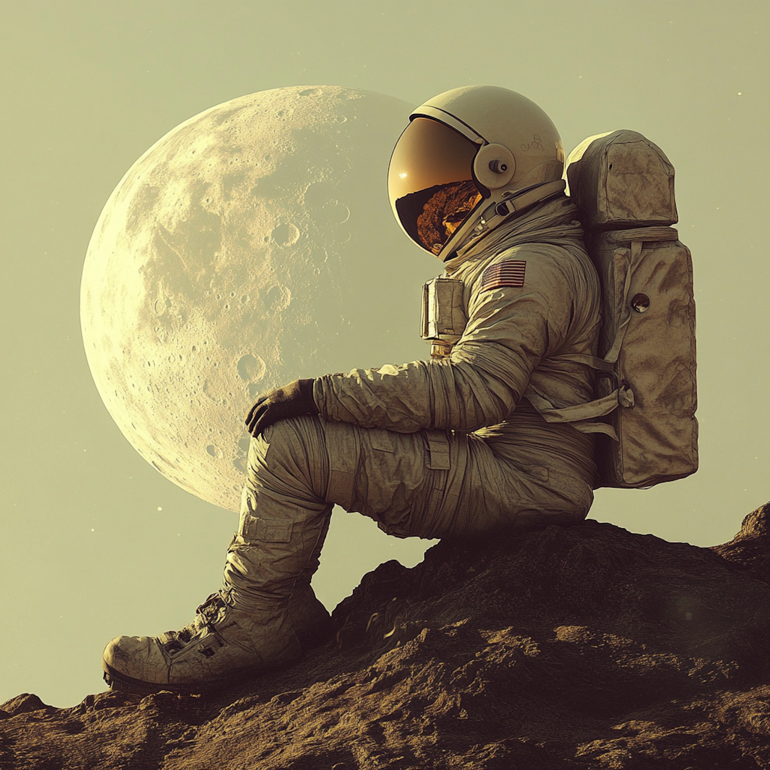 Astronaut in a white suit sits on a rocky surface with the moon in the background, reflecting a golden hue on the visor.