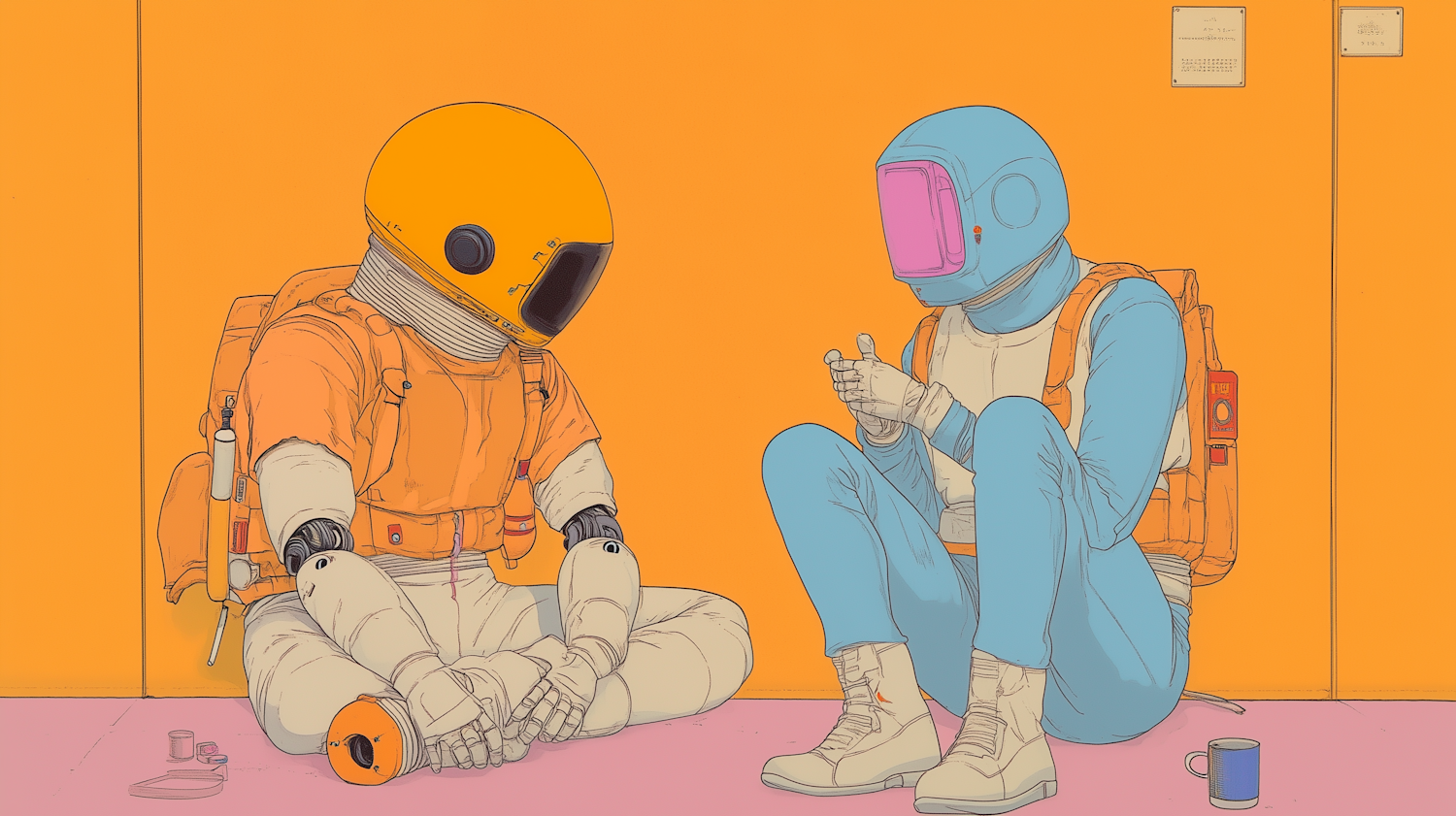 Two astronauts in colorful suits sit and converse against a vibrant orange wall, creating a striking and futuristic scene.