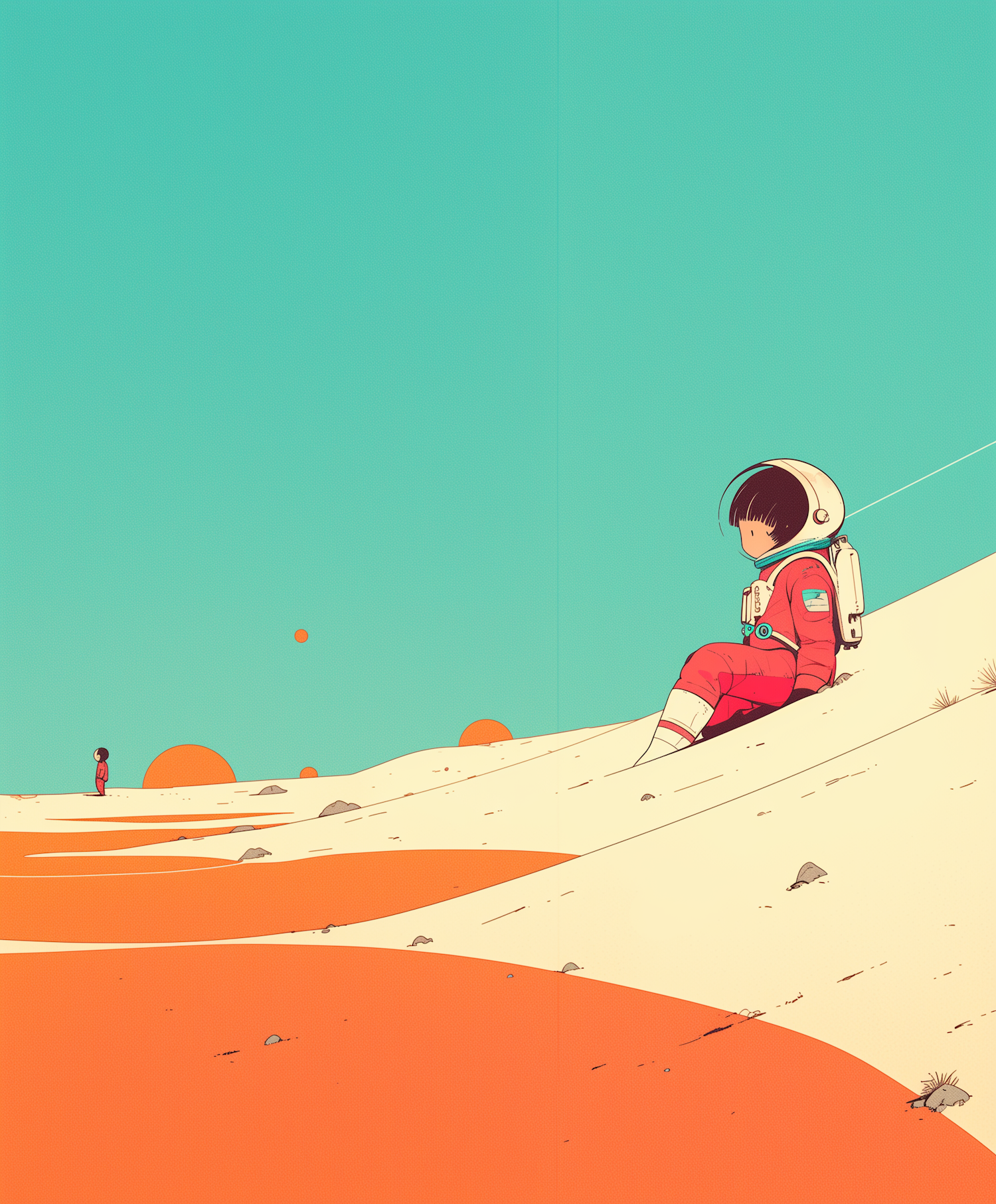 Futuristic illustration of two astronauts in red suits on a sandy dune with a turquoise sky and orange spheres on the horizon.