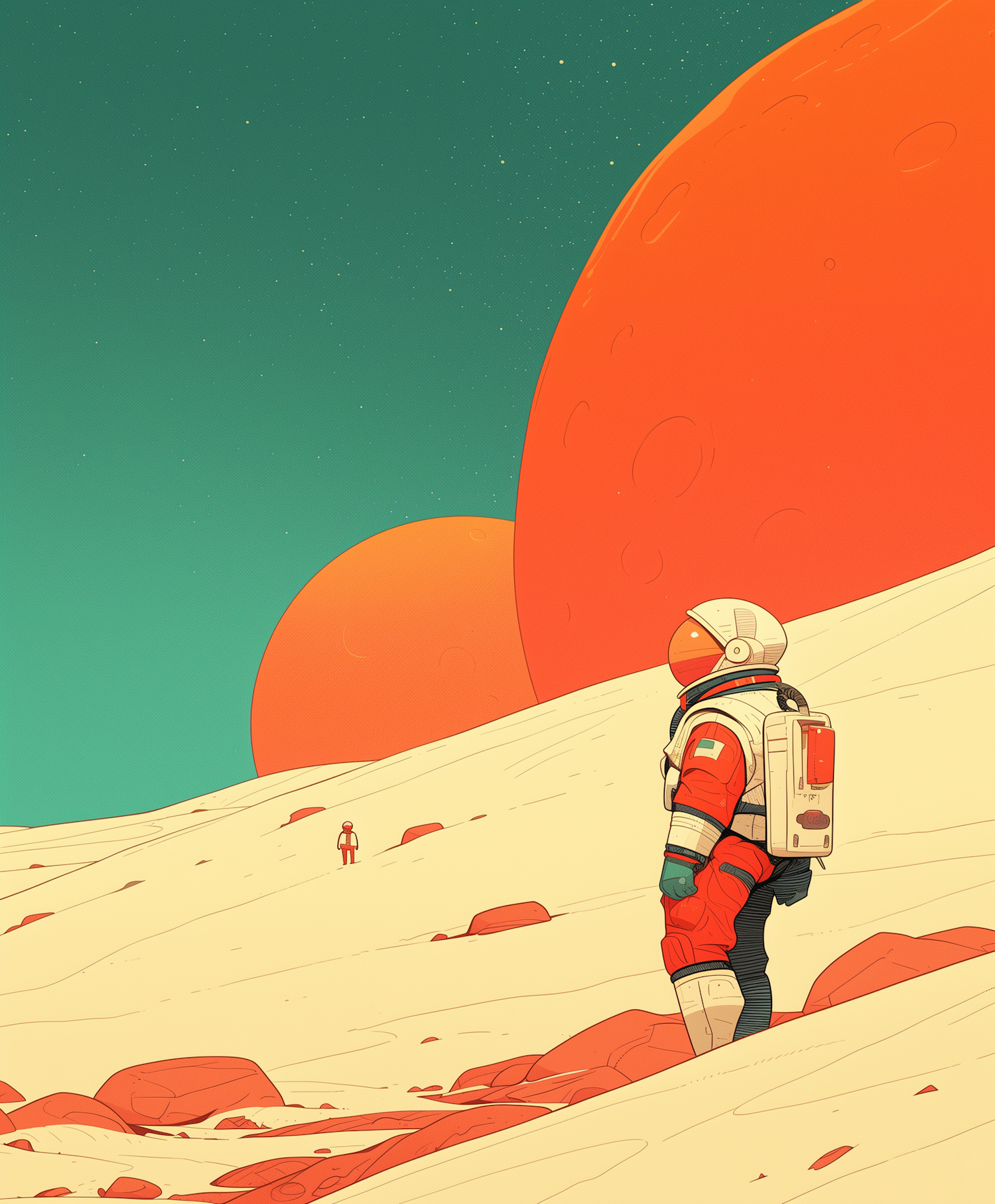 Astronauts explore a sandy alien landscape under a teal sky with two massive orange planets. Futuristic and surreal atmosphere.