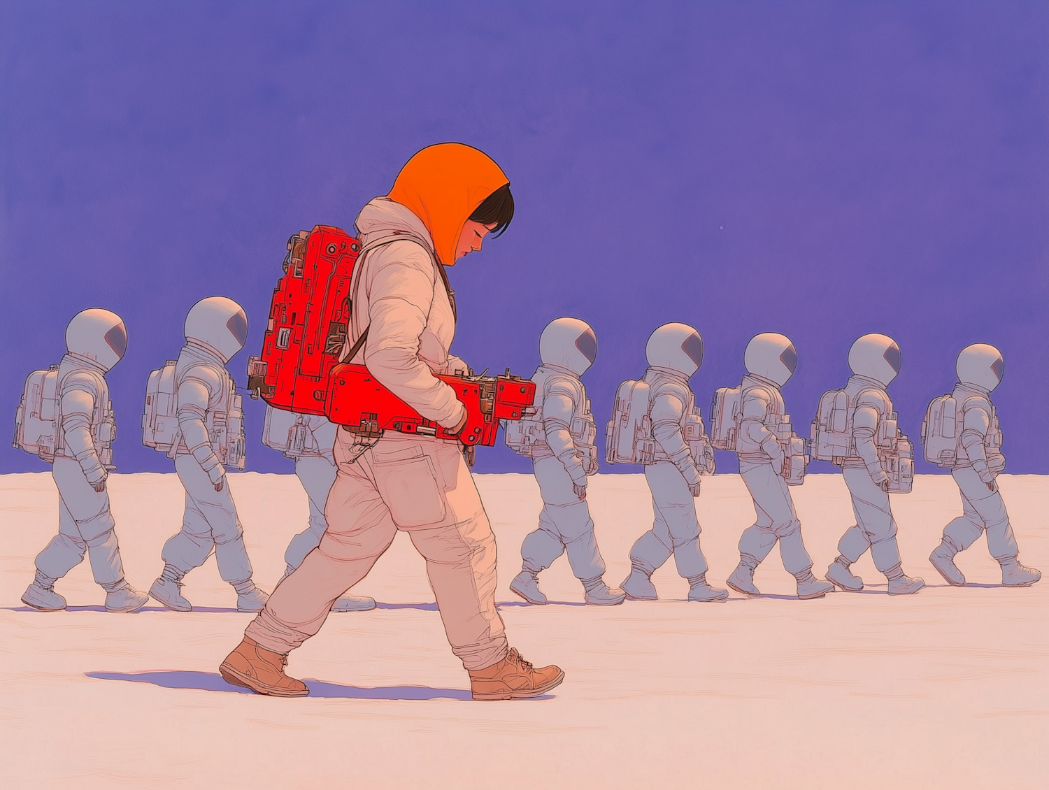 A person in an orange hood leads a line of astronauts in white suits across a barren landscape under a deep blue sky.