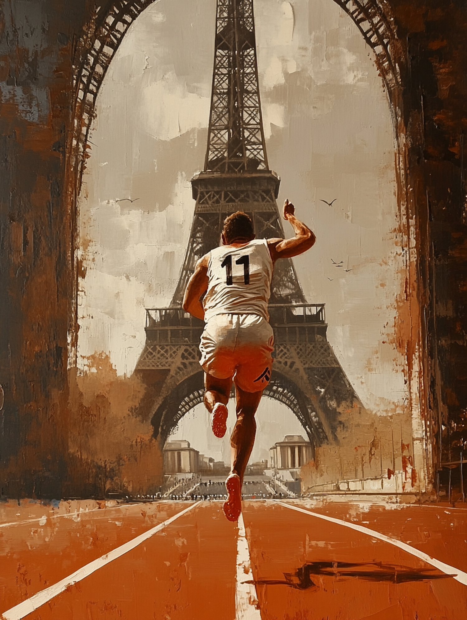 Illustration of a sprinter on a red track with the Eiffel Tower in the background, blending athleticism and Parisian charm.