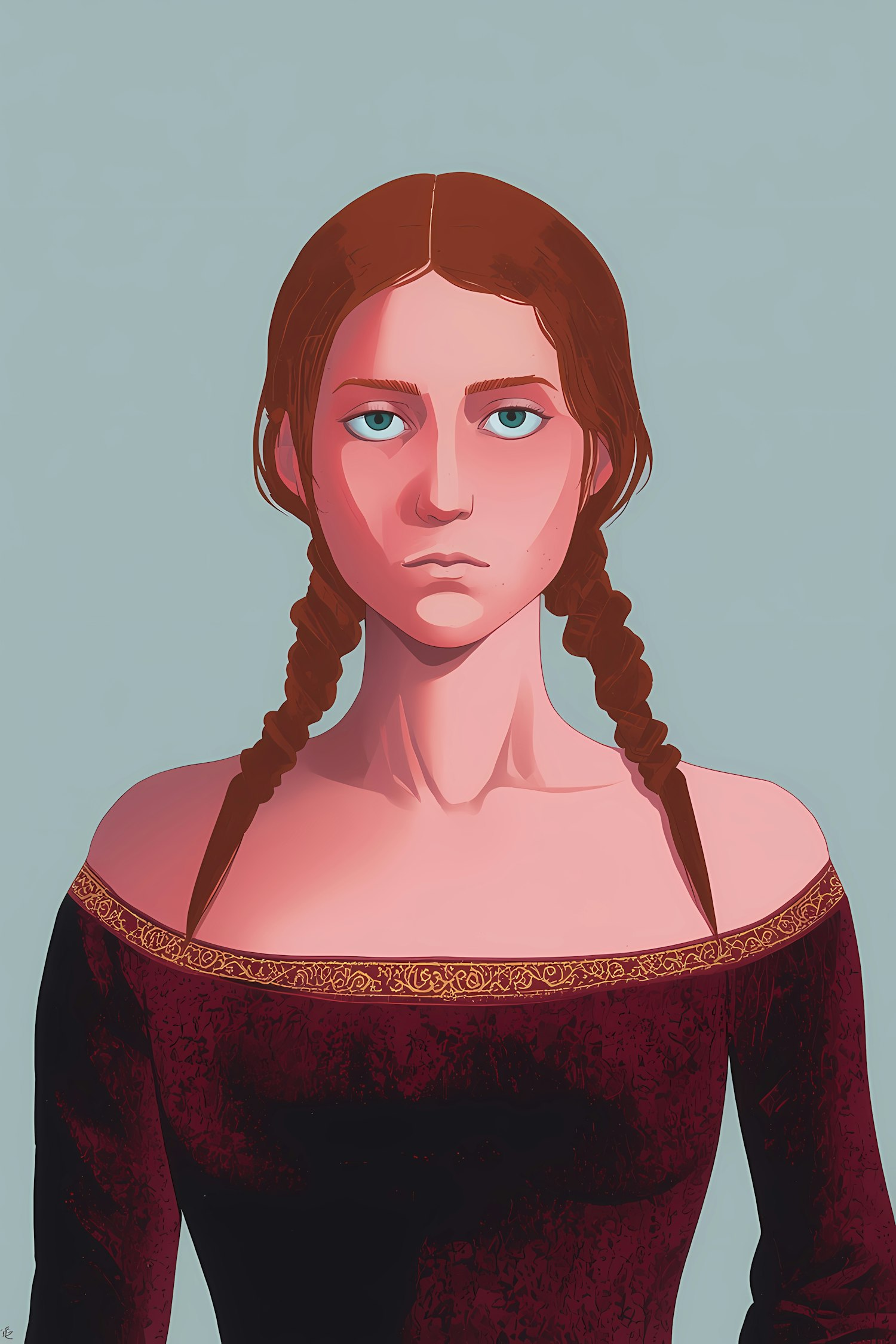 Digital illustration of a young woman with auburn braids, blue eyes, and a red embroidered dress against a muted blue background.