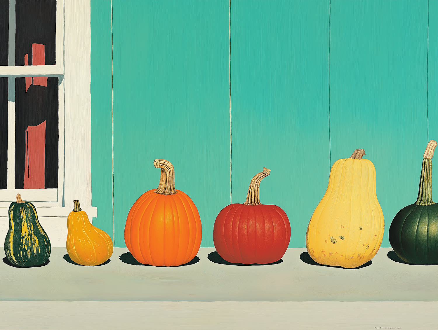 Colorful gourds and pumpkins lined up against a turquoise wall, creating a vibrant and balanced composition.