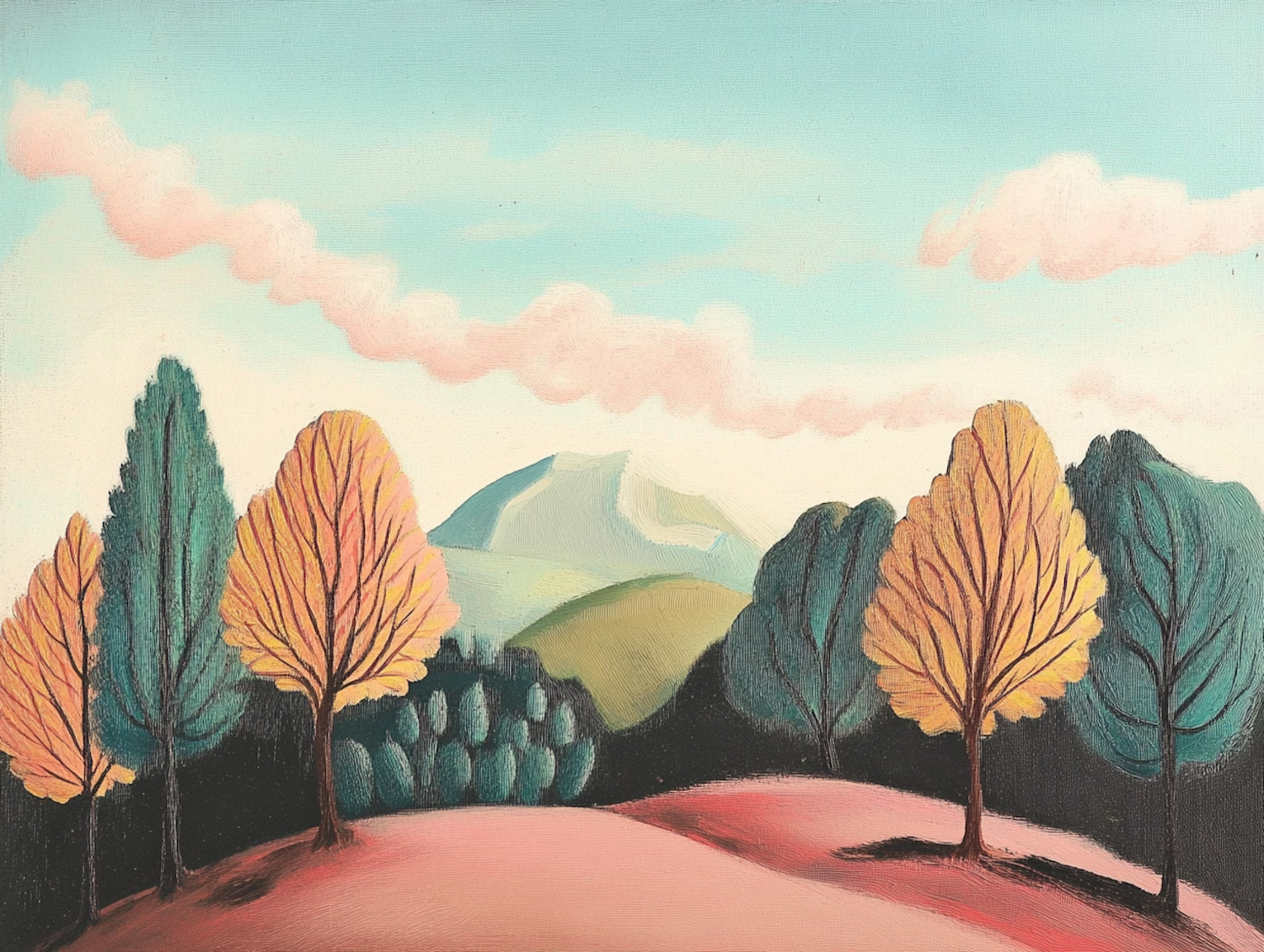 A dreamy landscape painting with colorful trees, pink clouds, and rolling hills, perfect for adding a serene touch to any space.