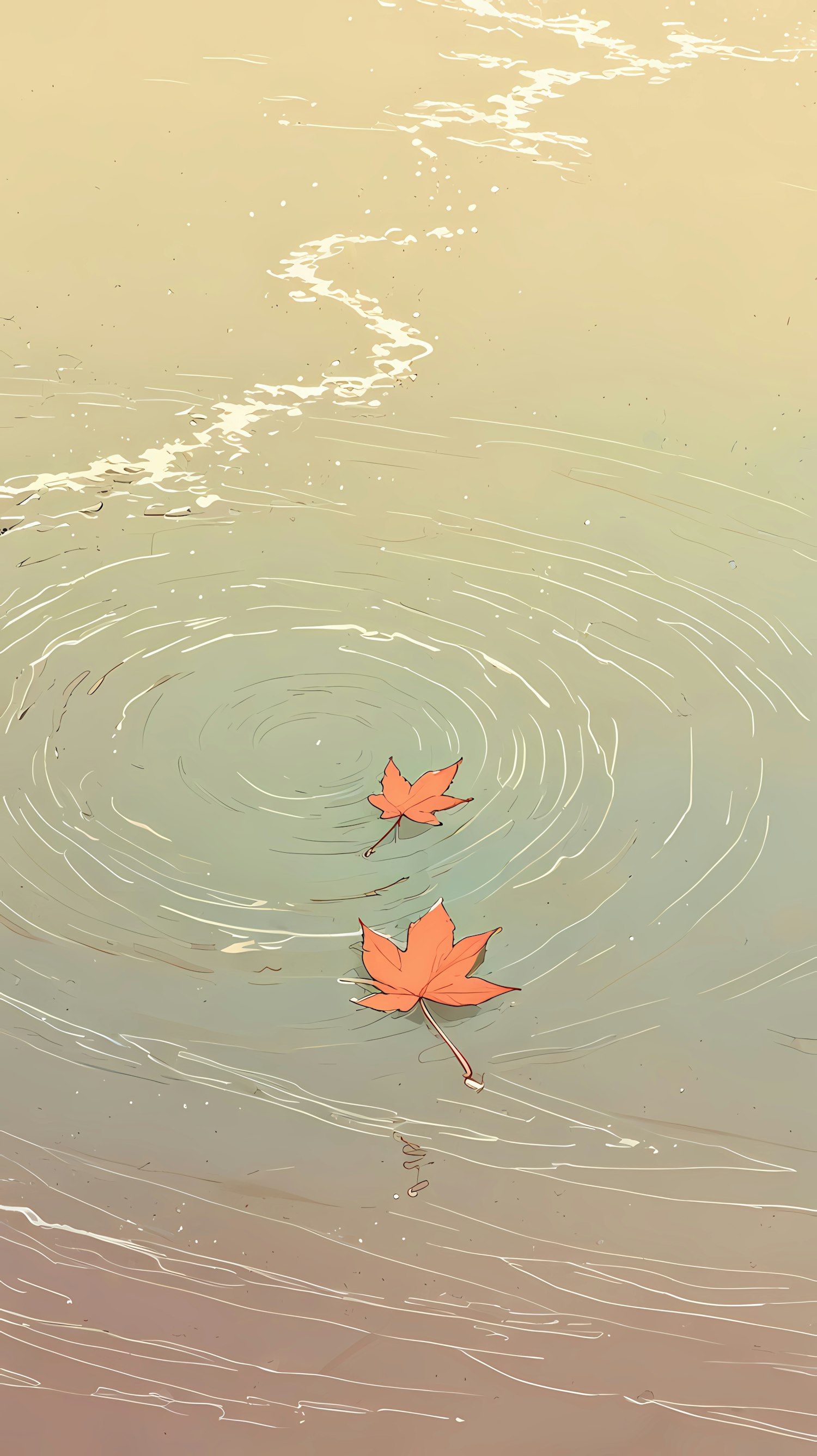 Calming illustration of autumn leaves floating on rippled water, surrounded by soft gradients and delicate wave patterns.