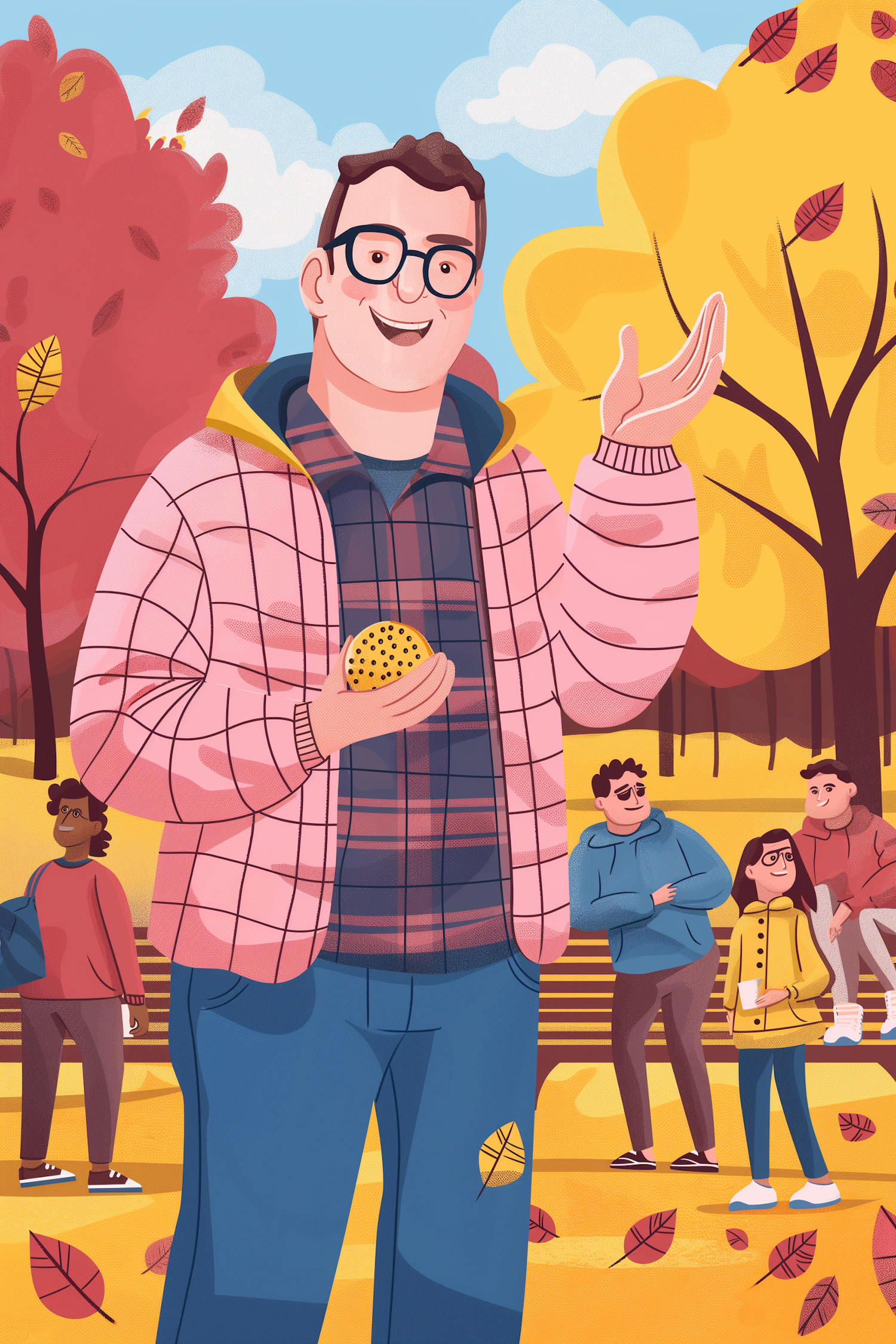 Illustration of a man in a pink jacket holding a dotted object in an autumn park, surrounded by colorful trees and people.