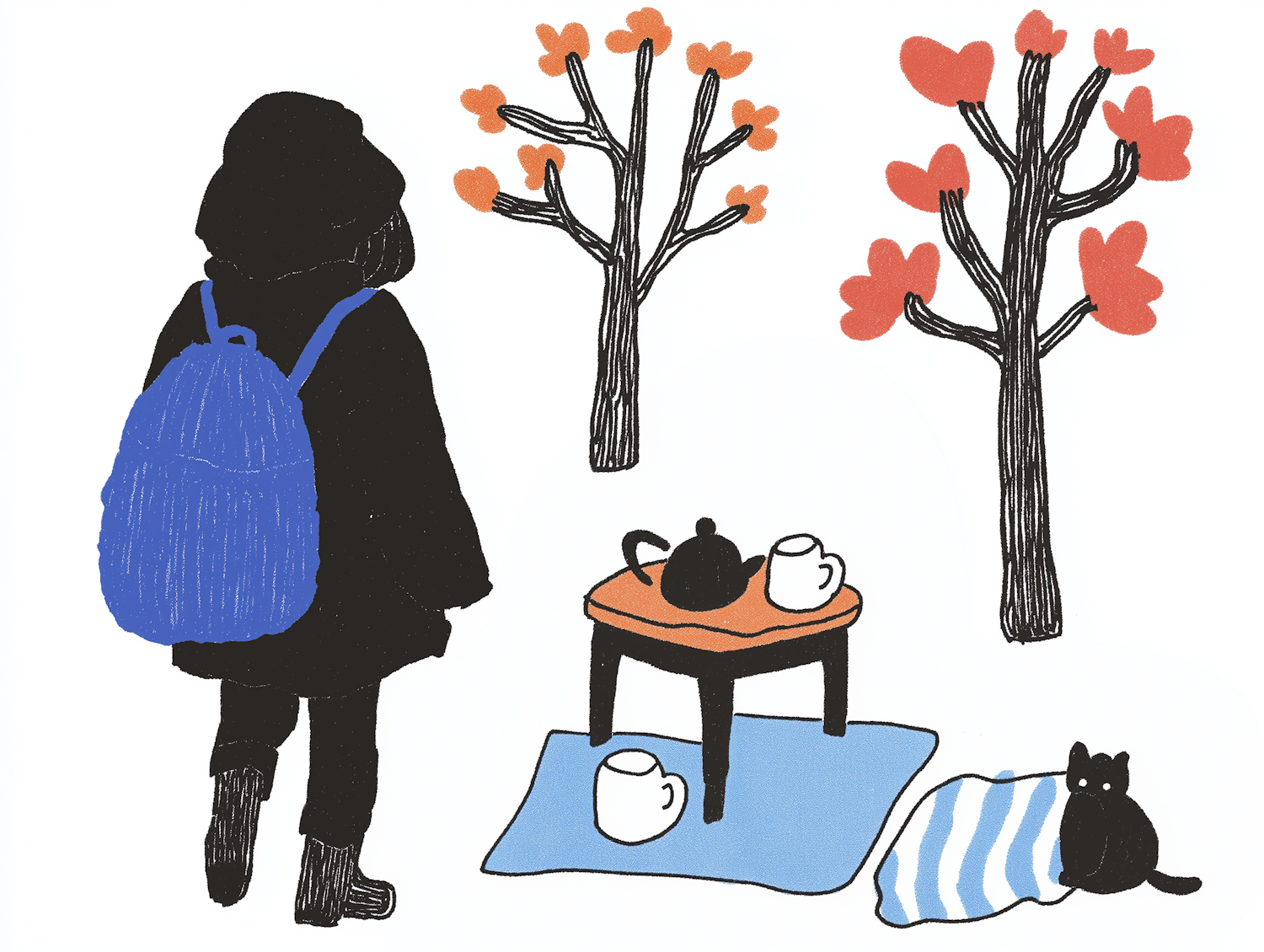 Charming illustration of a person with a blue backpack, autumn trees, a tea setup, and a black cat on a striped blanket.