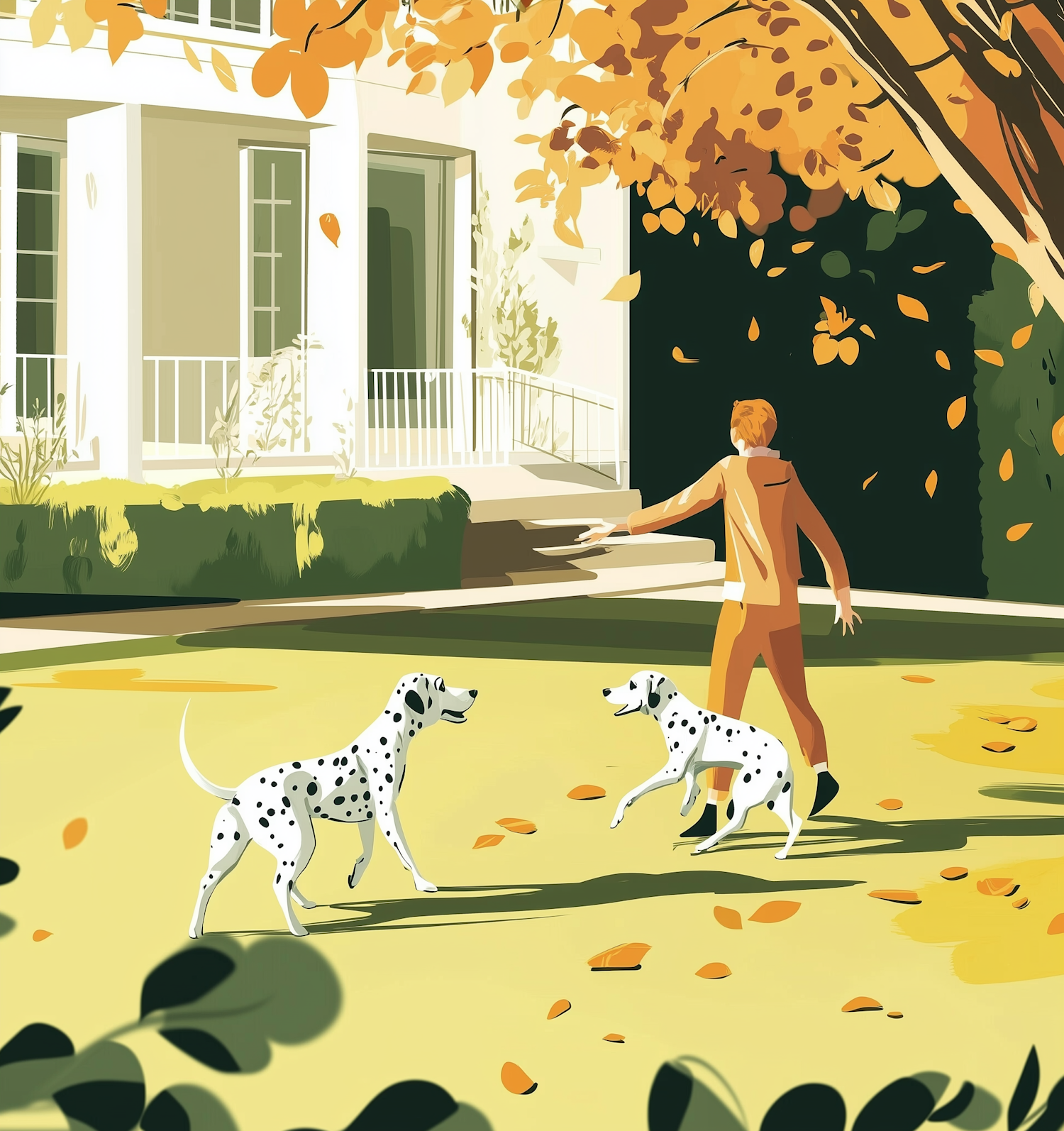 Man playing with two Dalmatians in a sunlit autumn garden, surrounded by falling leaves and a white house in the background.