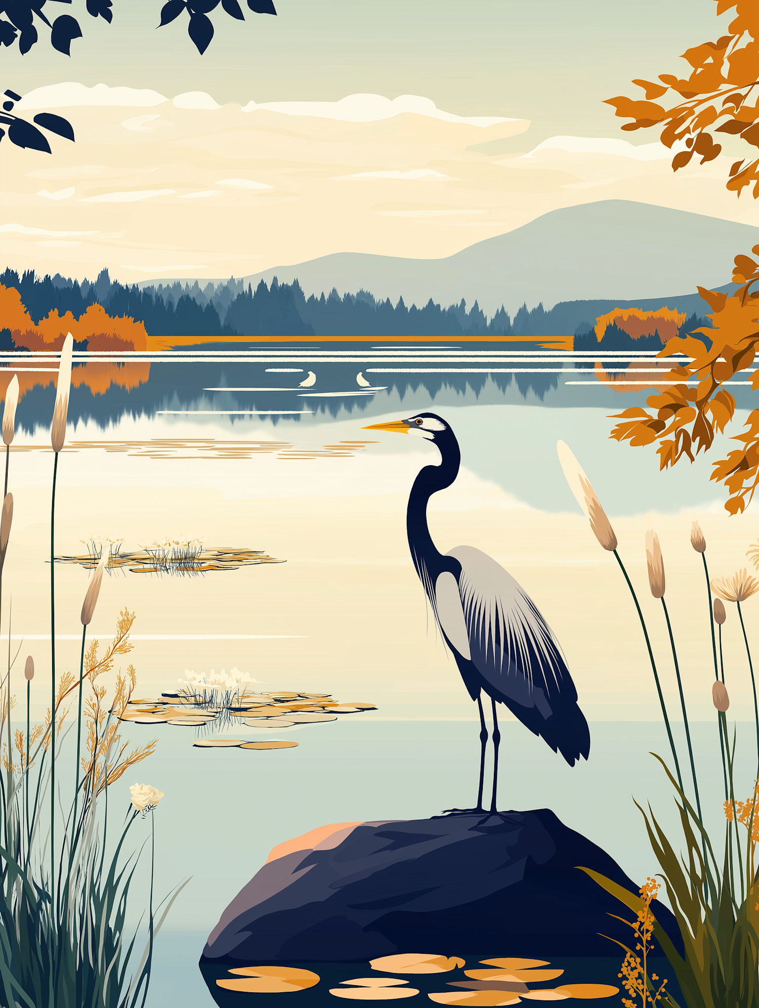 Illustration of a heron by a tranquil lake with autumn foliage, reflecting serene natural beauty and peacefulness.