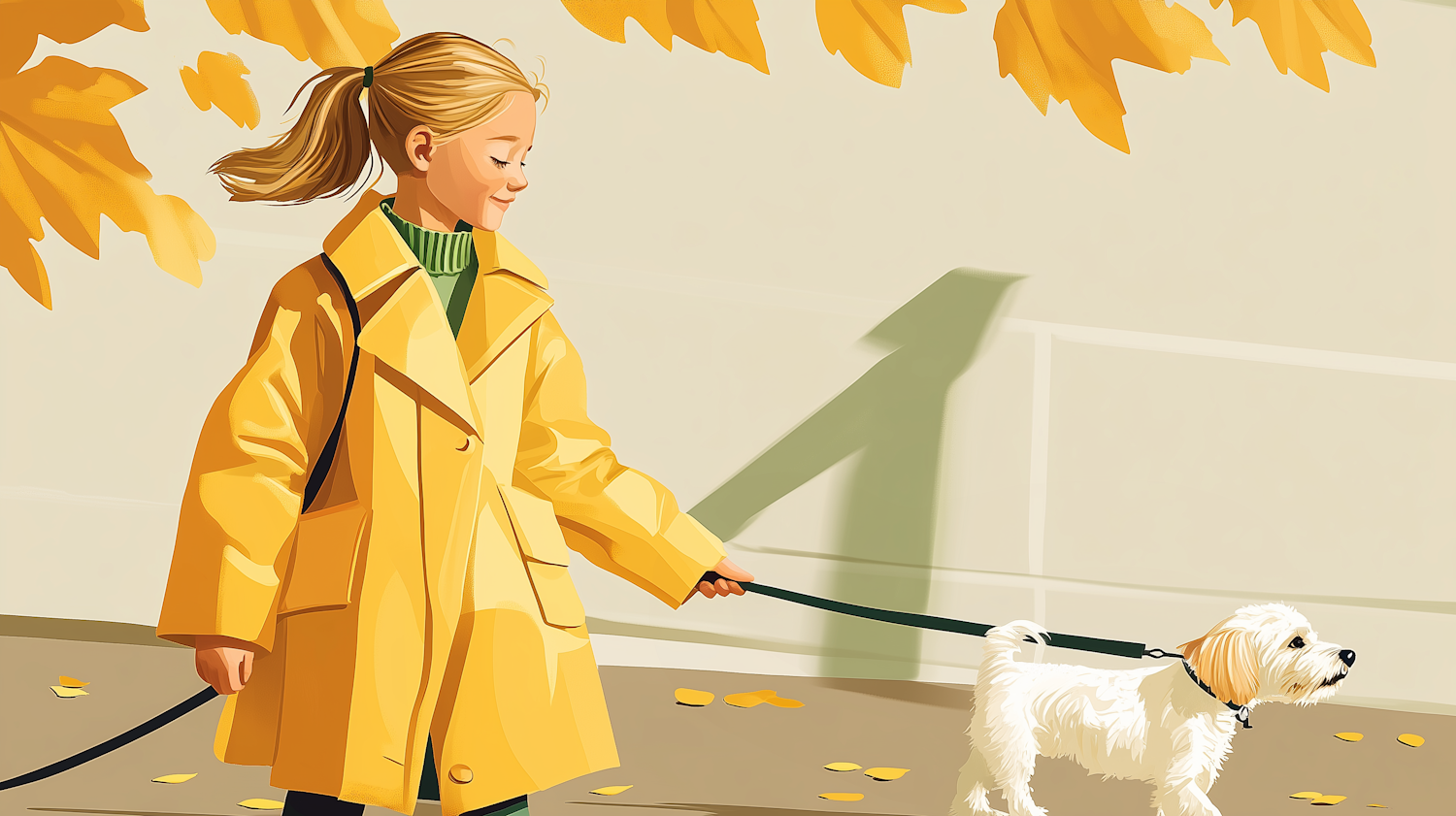 Illustration of a girl in a yellow coat walking a white dog on a leash, surrounded by autumn leaves.