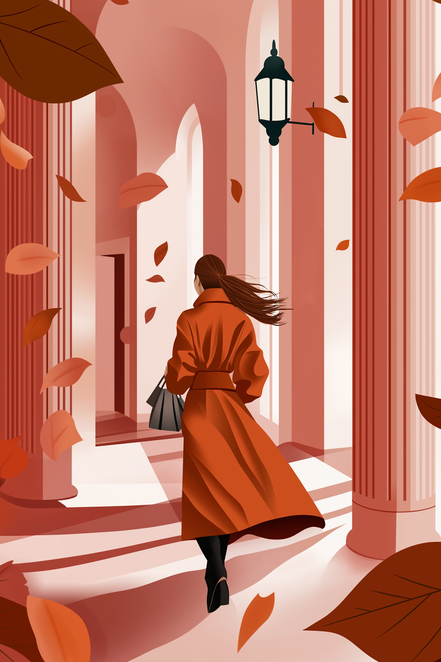 Elegant woman in orange coat walks through a colonnade with swirling autumn leaves, creating a warm and sophisticated scene.
