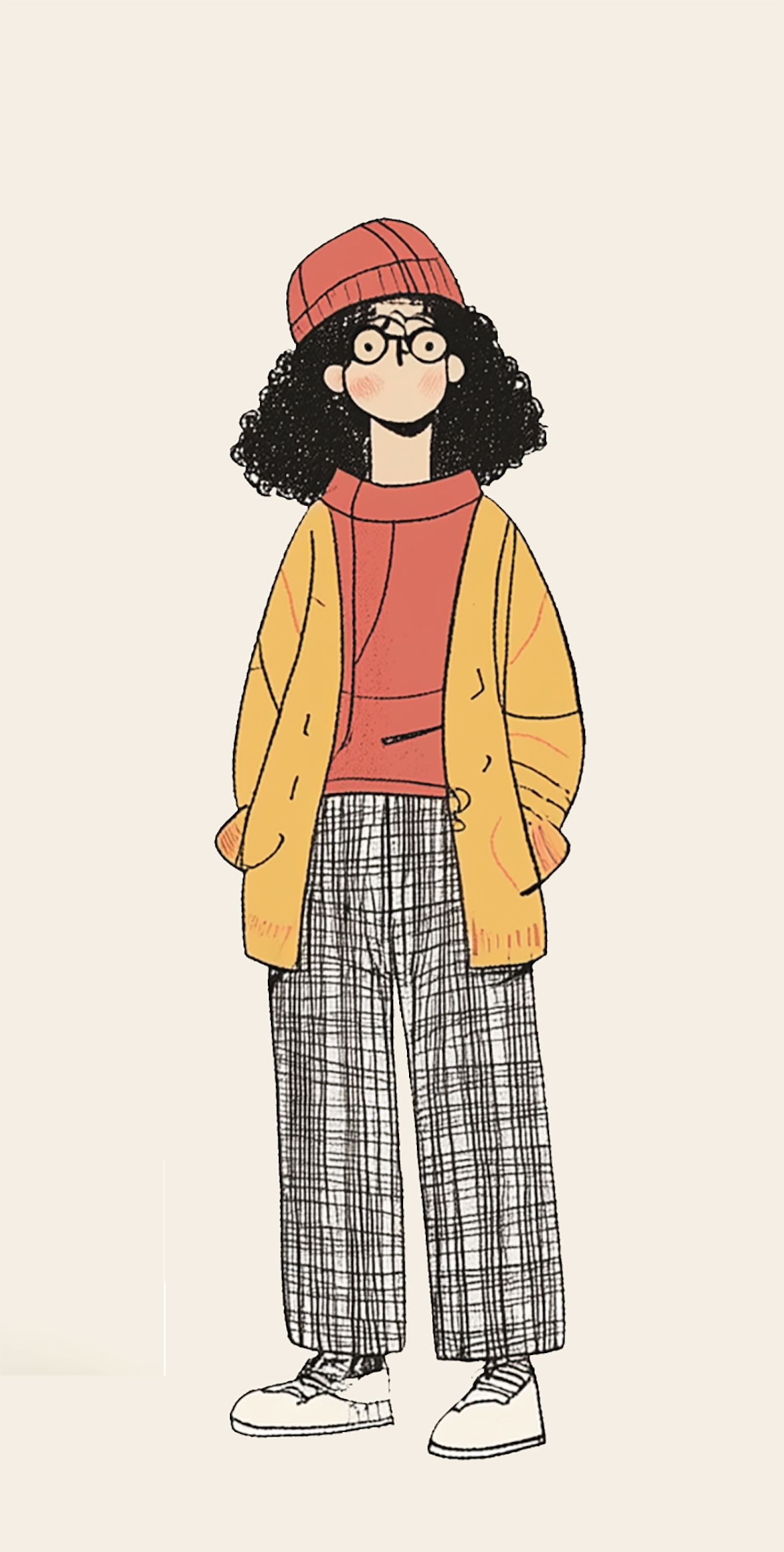 Cartoon character with curly hair, glasses, and a cozy outfit featuring a red beanie, yellow cardigan, and plaid pants.