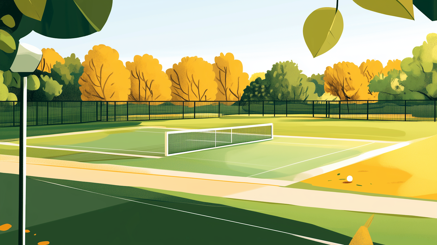 Illustrated tennis court in autumn with golden trees and a clear sky, creating a serene and inviting atmosphere.