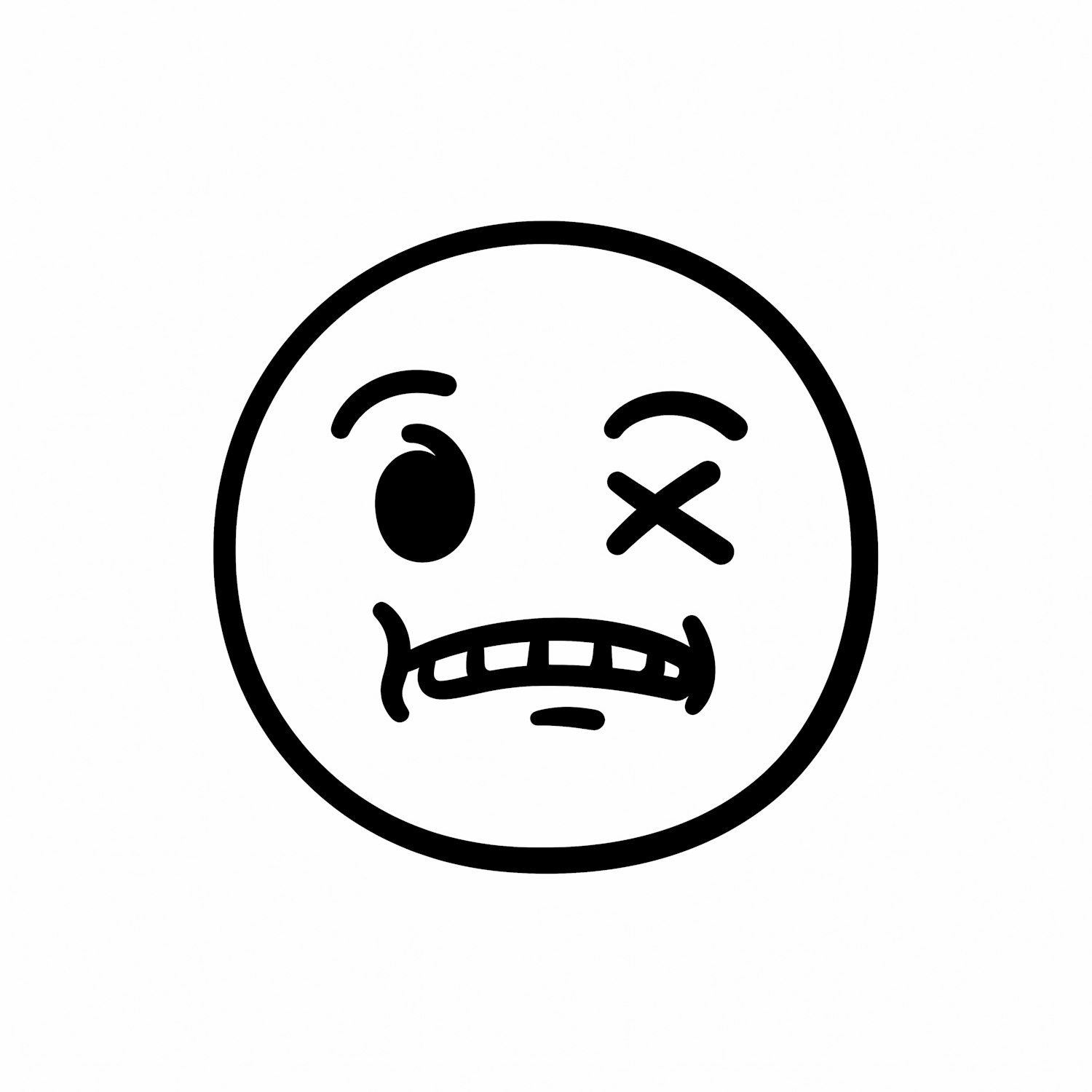 A black and white emoji illustration showing a quirky expression with one eye as an 'X' and clenched teeth.