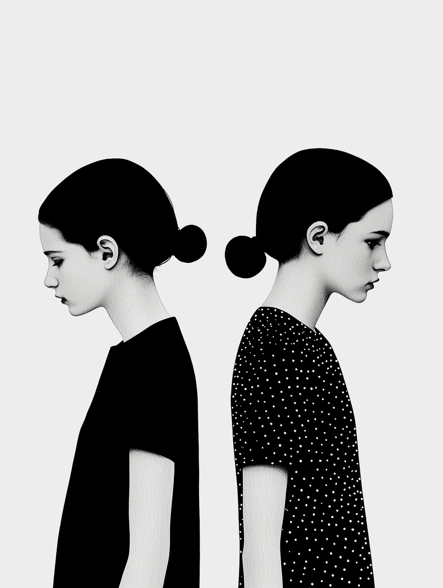 Minimalist illustration of two women standing back-to-back, one in a black shirt and the other in polka dots, against a plain background.
