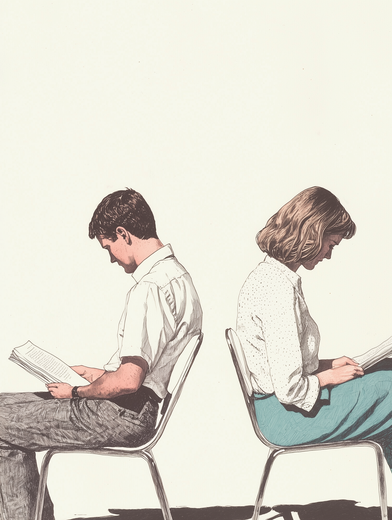 Illustration of a man and woman sitting back-to-back, reading documents. Minimalist style with focus on concentration and posture.