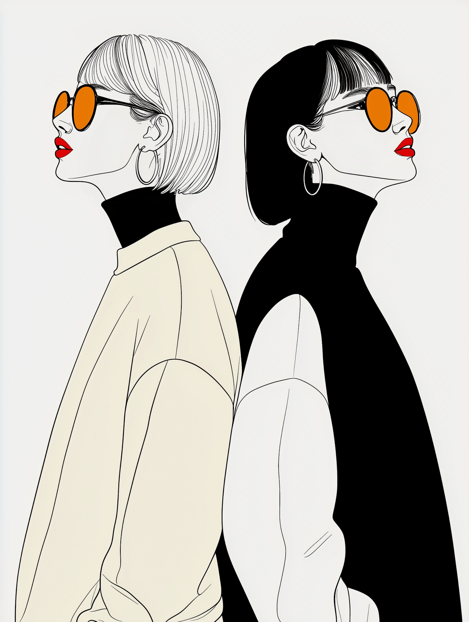 Minimalist illustration of two women in turtlenecks with orange sunglasses and red lipstick, showcasing modern style and elegance.
