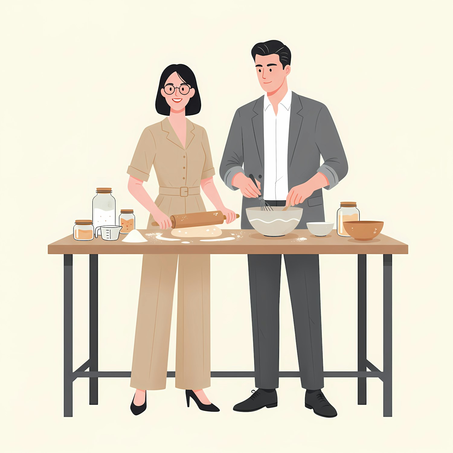 A man and woman baking together, with ingredients and tools on a wooden table, creating a cozy and collaborative kitchen scene.