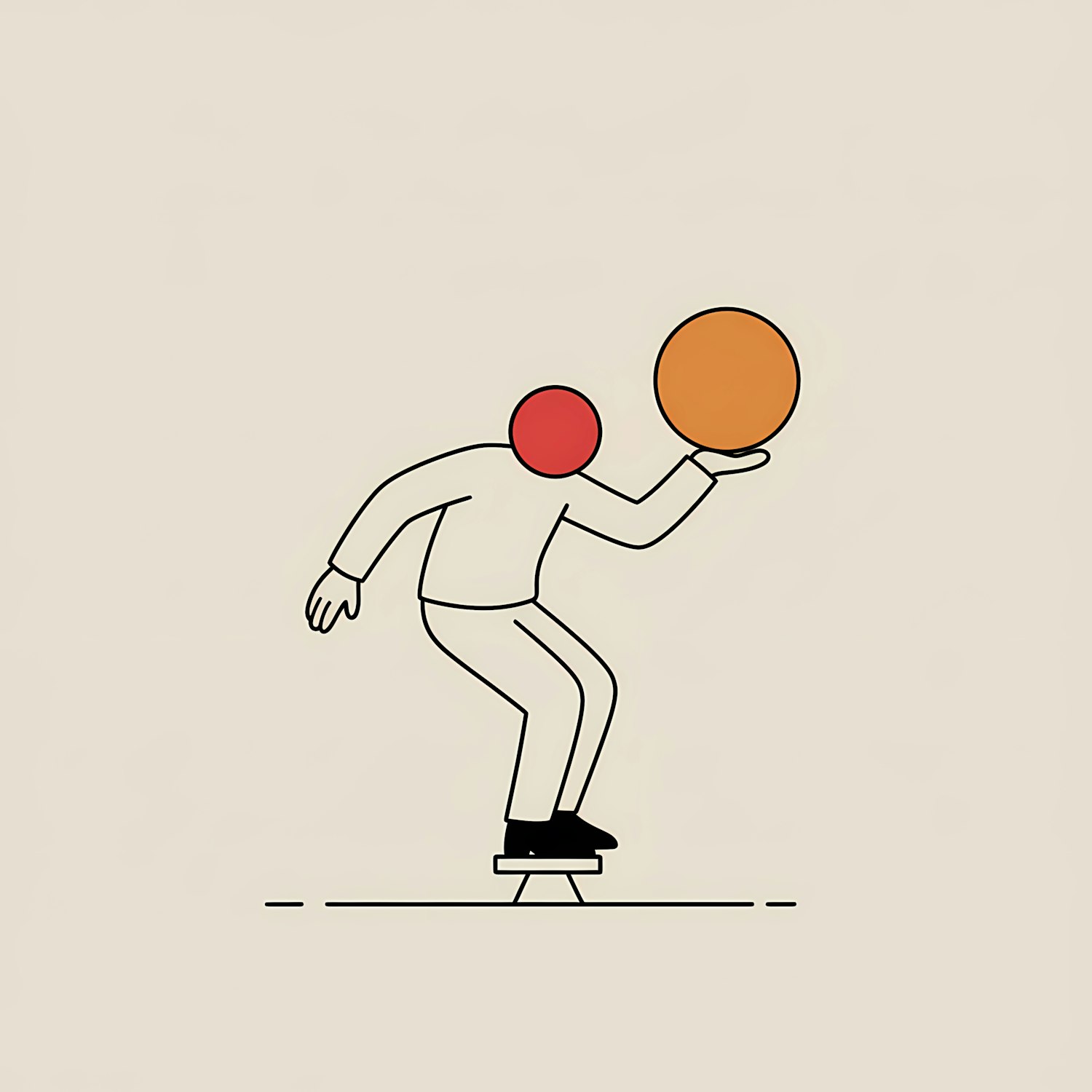 Minimalist illustration of a figure balancing on a platform, holding an orange sphere, set against a clean beige background.