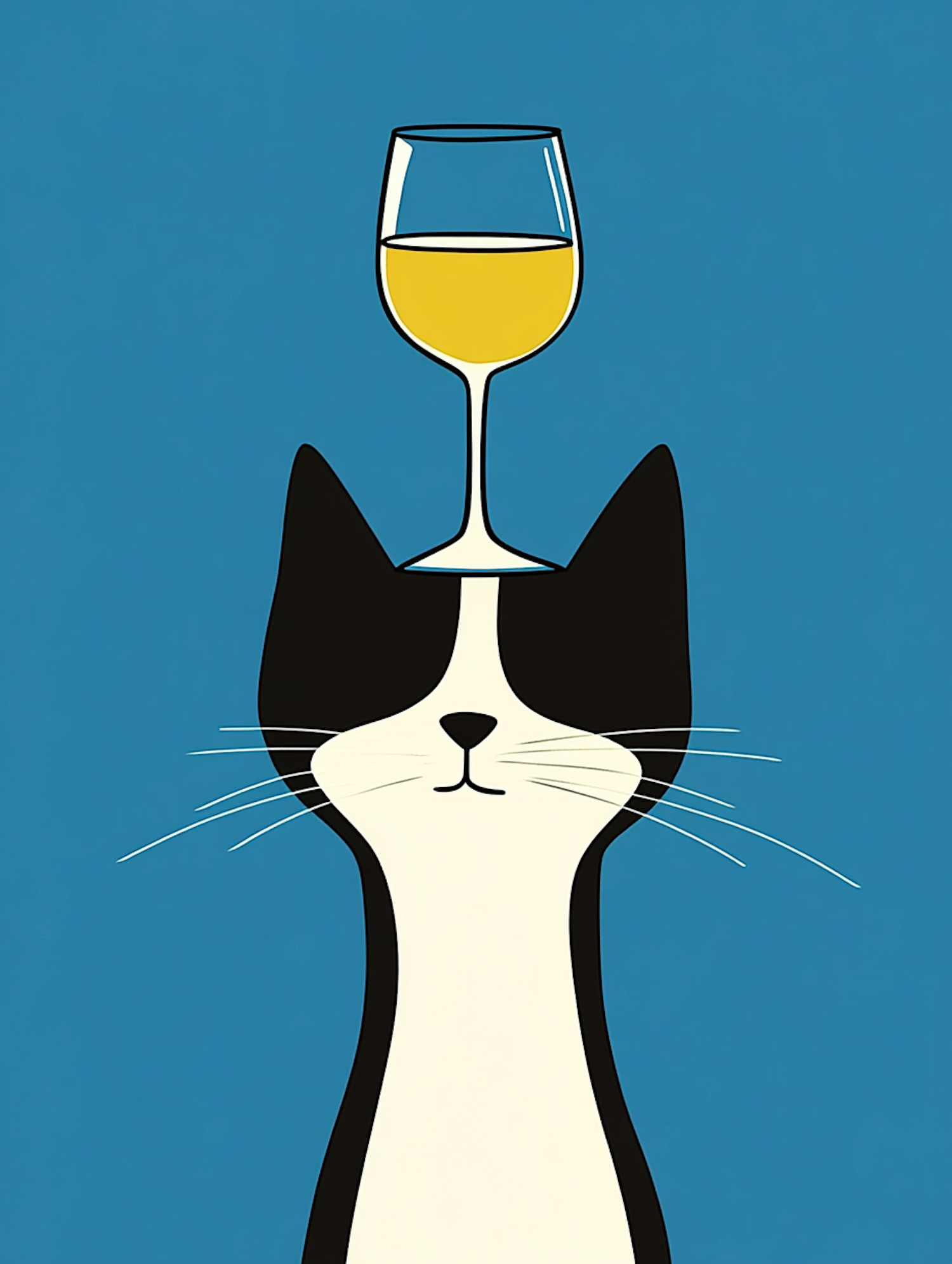 A black and white cat balances a wine glass filled with yellow liquid on its head, set against a blue background.