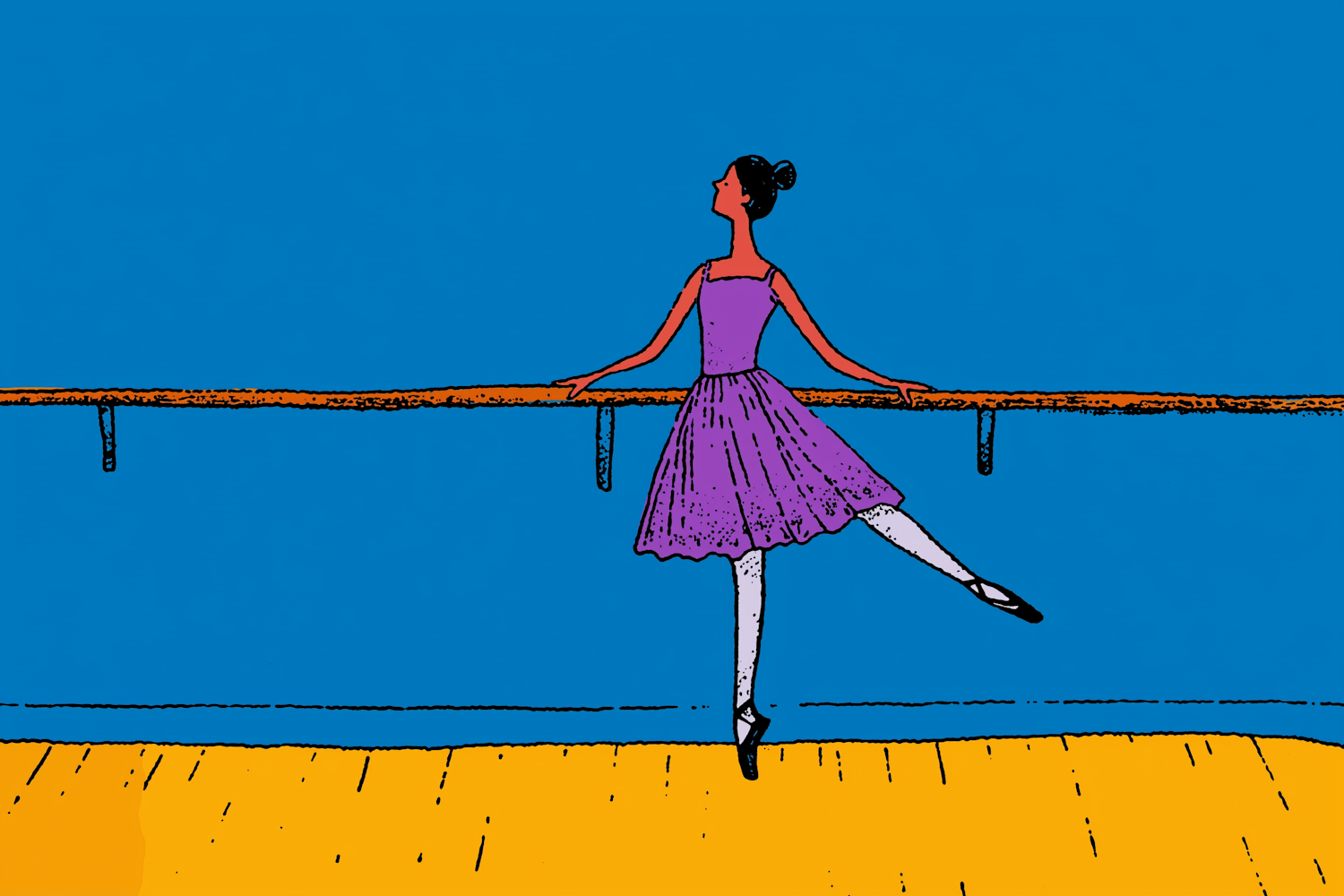 Illustration of a ballerina in a purple tutu practicing at a barre, set against a vibrant blue wall and yellow wooden floor.