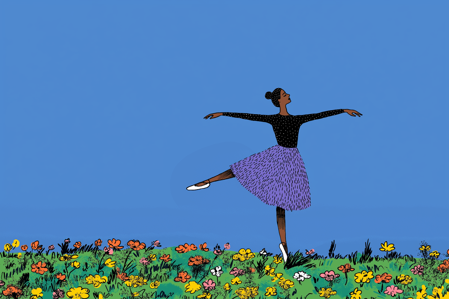 A ballerina in a purple skirt dances gracefully in a colorful meadow under a clear blue sky, surrounded by vibrant flowers.