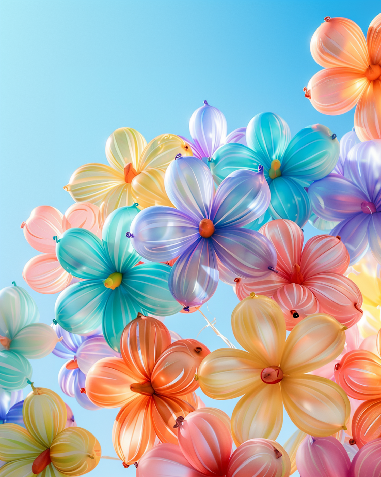 Colorful balloon flowers against a clear blue sky, creating a cheerful and whimsical atmosphere.