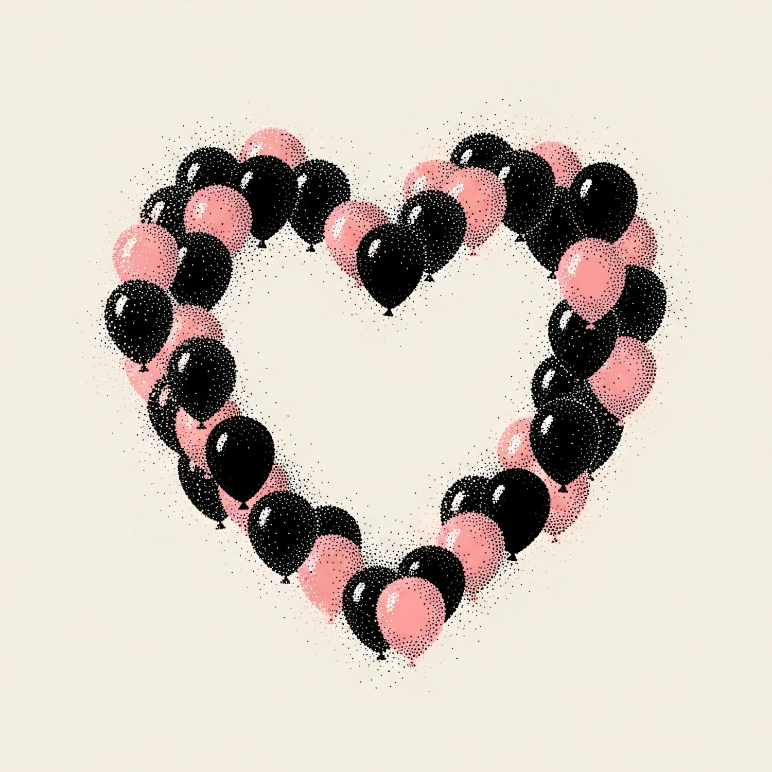 A heart shape made of black and pink balloons in a stippled artistic style, set against a light background for a striking visual effect.