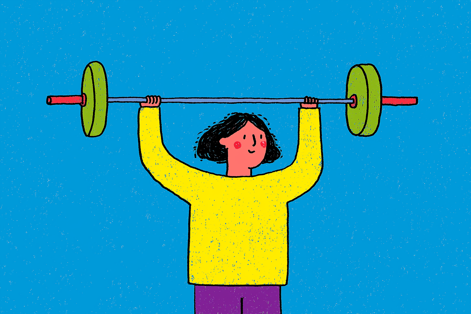 A cheerful illustration of a person lifting a barbell, wearing a yellow sweater and purple pants, set against a bright blue background.