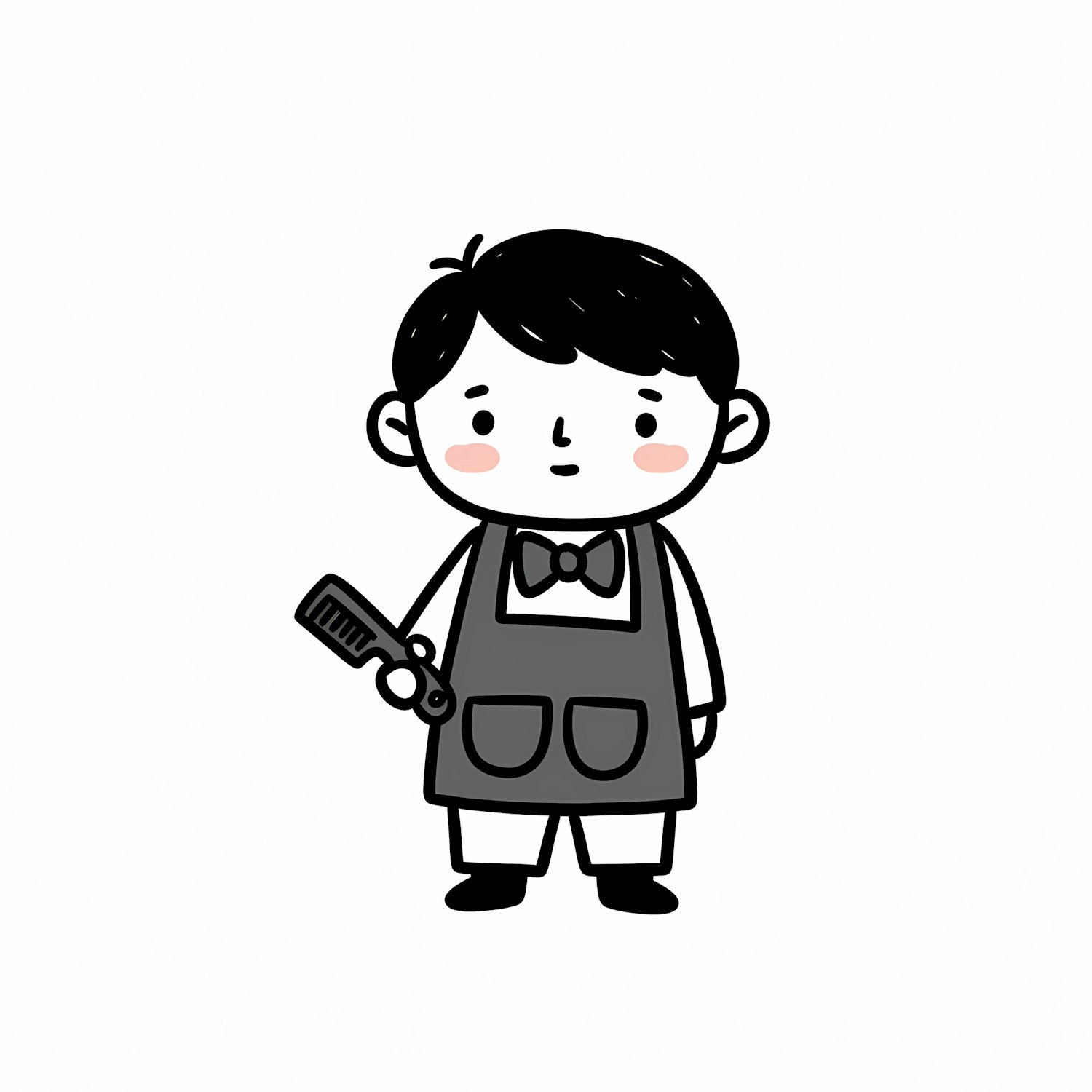 Cute cartoon barber character holding a comb, wearing a gray apron and bow tie, with a friendly expression and rosy cheeks.