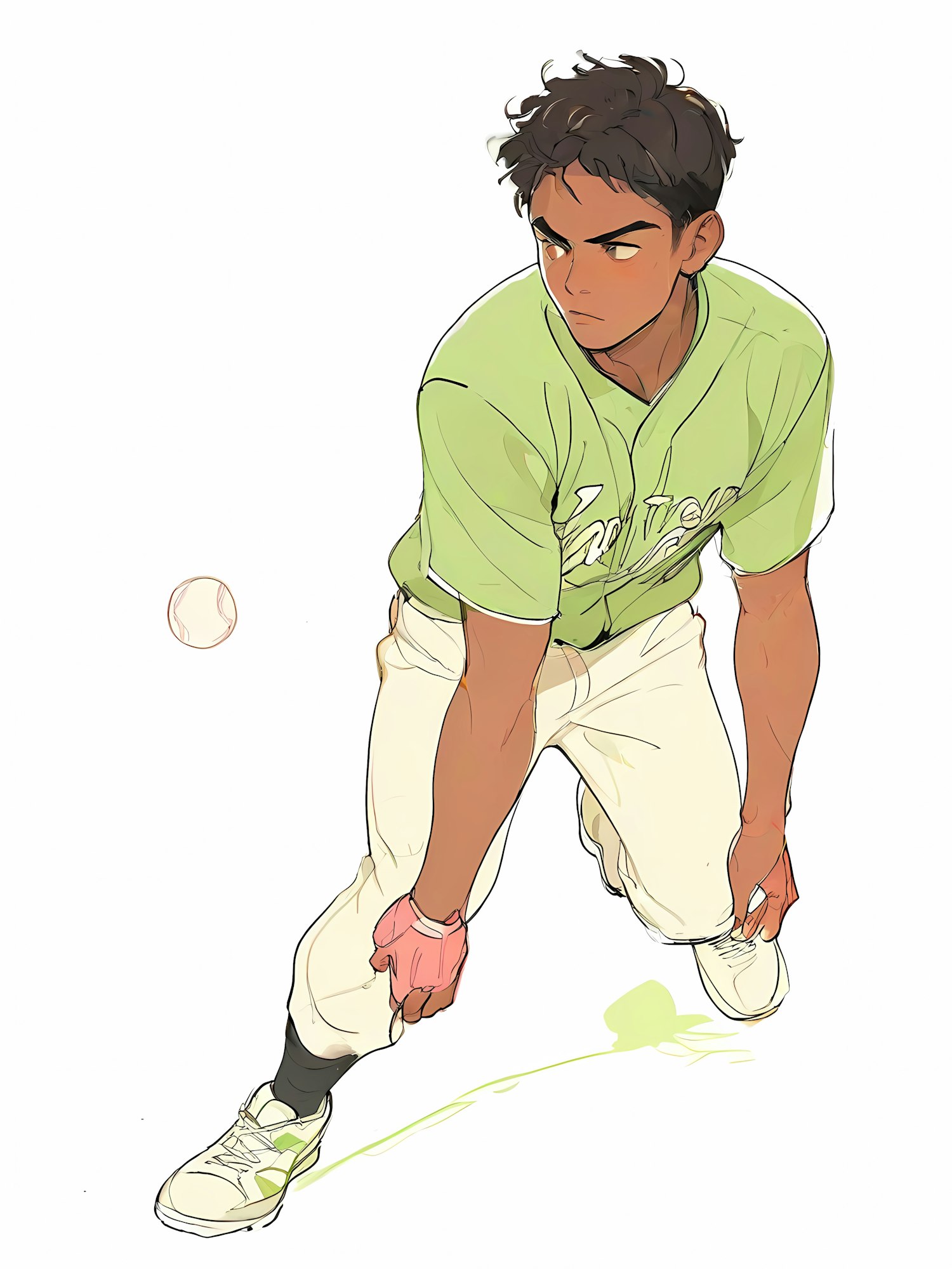 Dynamic illustration of a focused baseball player in a green jersey, mid-throw, with a minimal white background.